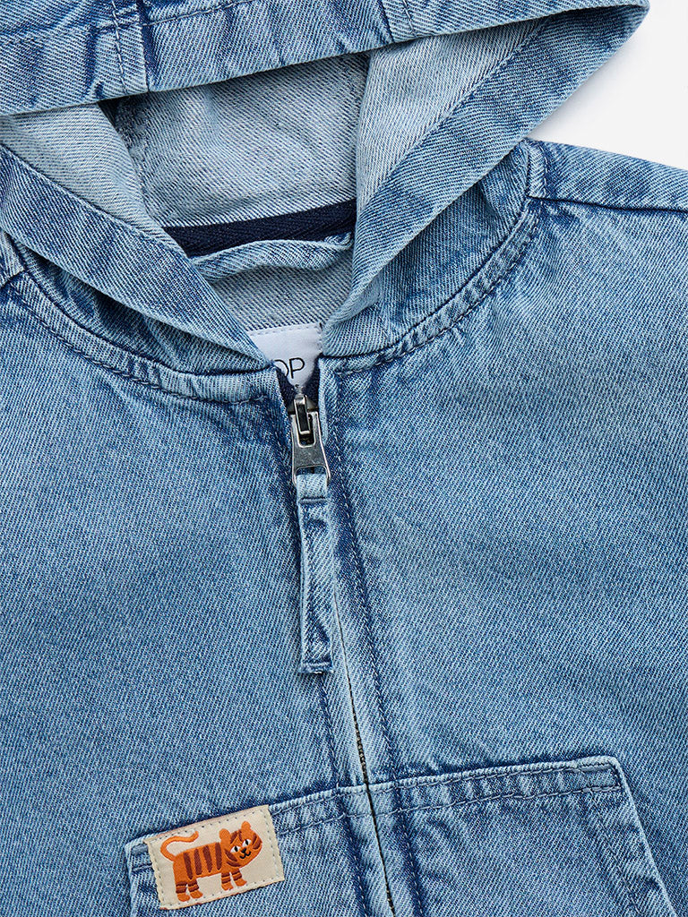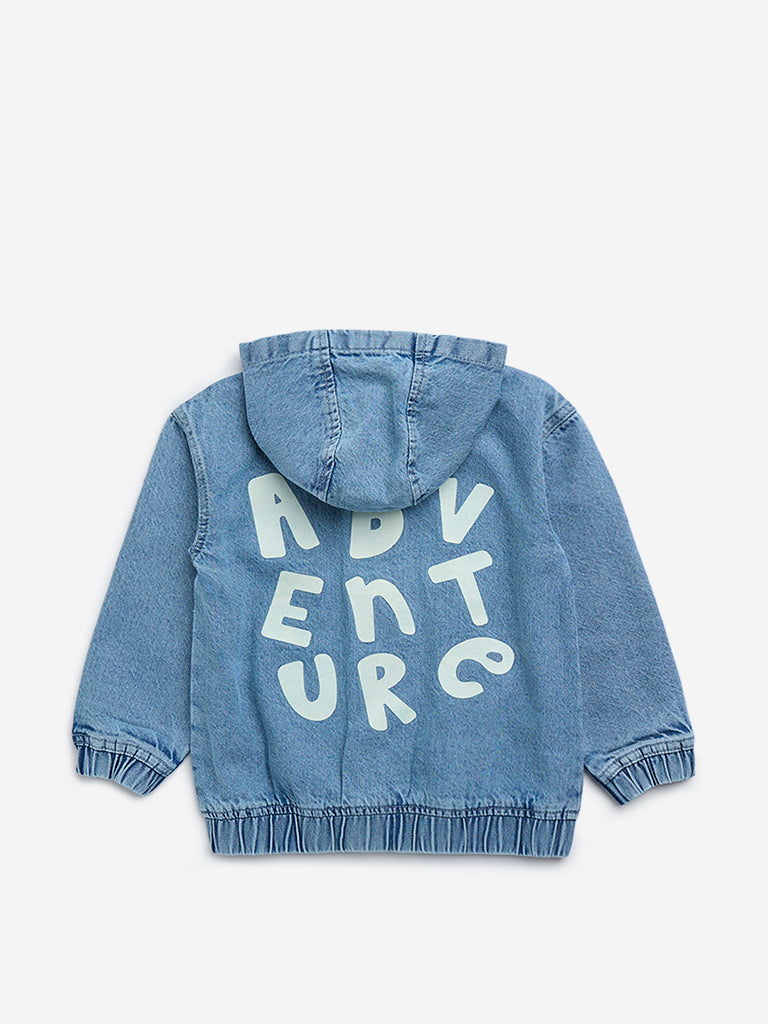 This blue denim jacket from HOP kids showcases text designs at the back. Milled from a cotton-rich fabric. it is designed with a hood. zipper placket. and full sleeves. The kangaroo pockets render practicality.