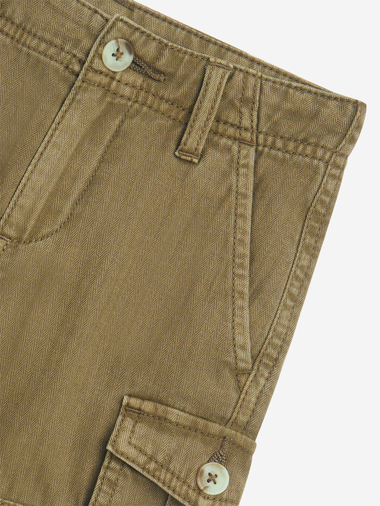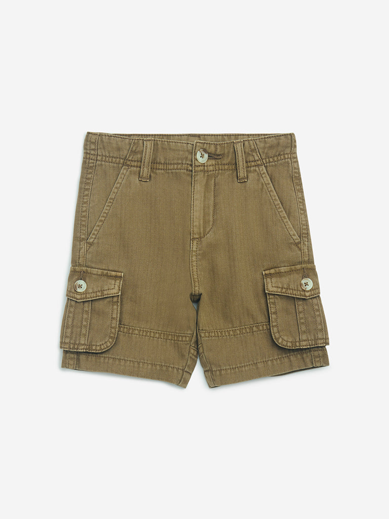 HOP Kids launches these brown denim shorts. designed with a cargo frame for a functional yet stylish look. Built from a cotton-rich fabric. they feature a buttoned waistband. belt loops. a zipper fly. and multiple pockets for added convenience.