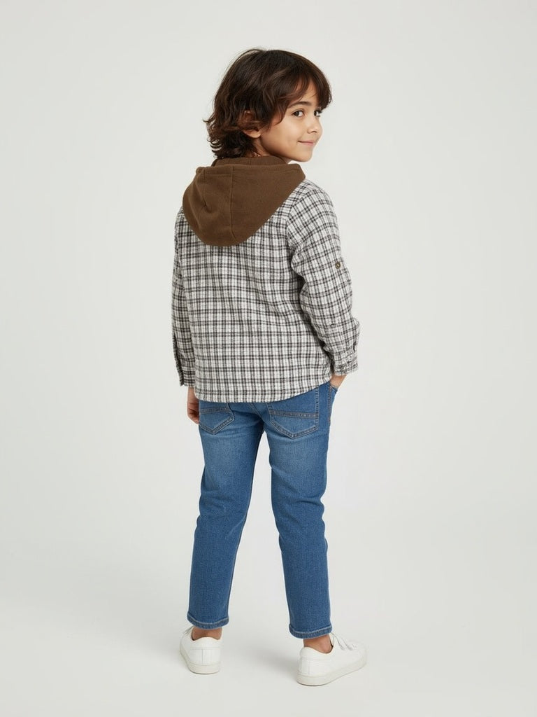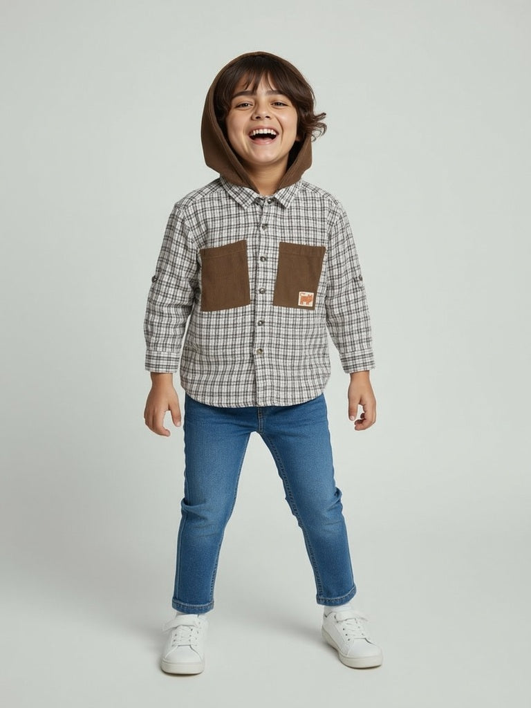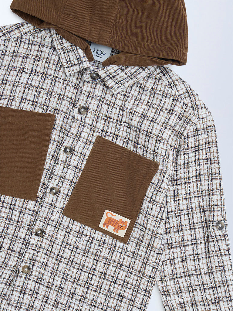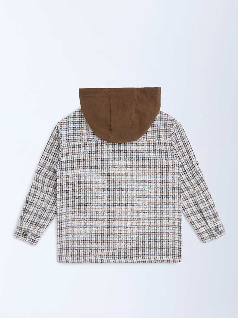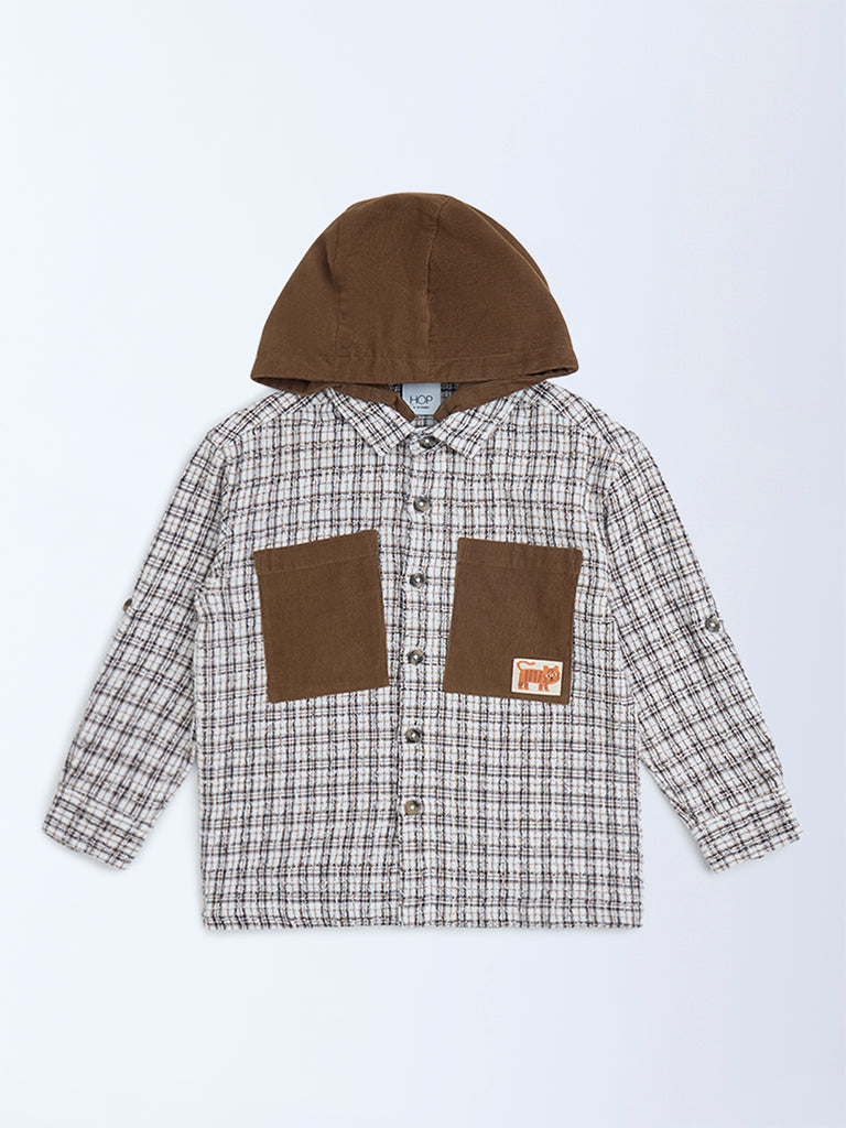 HOP Kids Brown Checkered Hooded Cotton Shirt