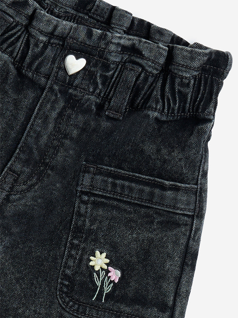 These charcoal denim shorts from HOP Kids are a stylish blend of comfort and charm. Made from pure cotton. they feature a mid-rise fit with a ruffled buttoned waistband and classic zipper fly. Delicate floral embroidery adds a playful touch. while multiple pockets make them perfect for everyday adventures.