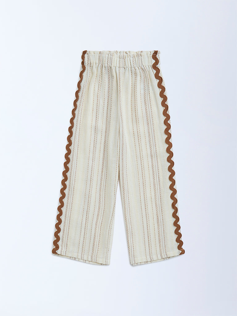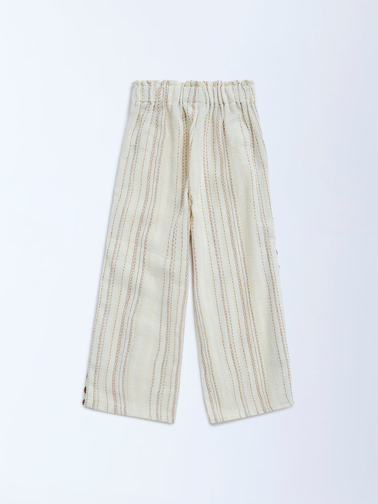 HOP Kids Cream Embroidered High-Rise Cotton Trousers