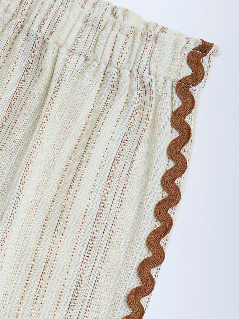 Make dressing easy and stylish with these cream trousers from HOP Kids. Embroidered stripes add subtle texture. while the premium woven fabric feels soft against delicate skin. The smooth elastic waistband ensures a fuss-free fit. letting kids move freely through everyday adventures.