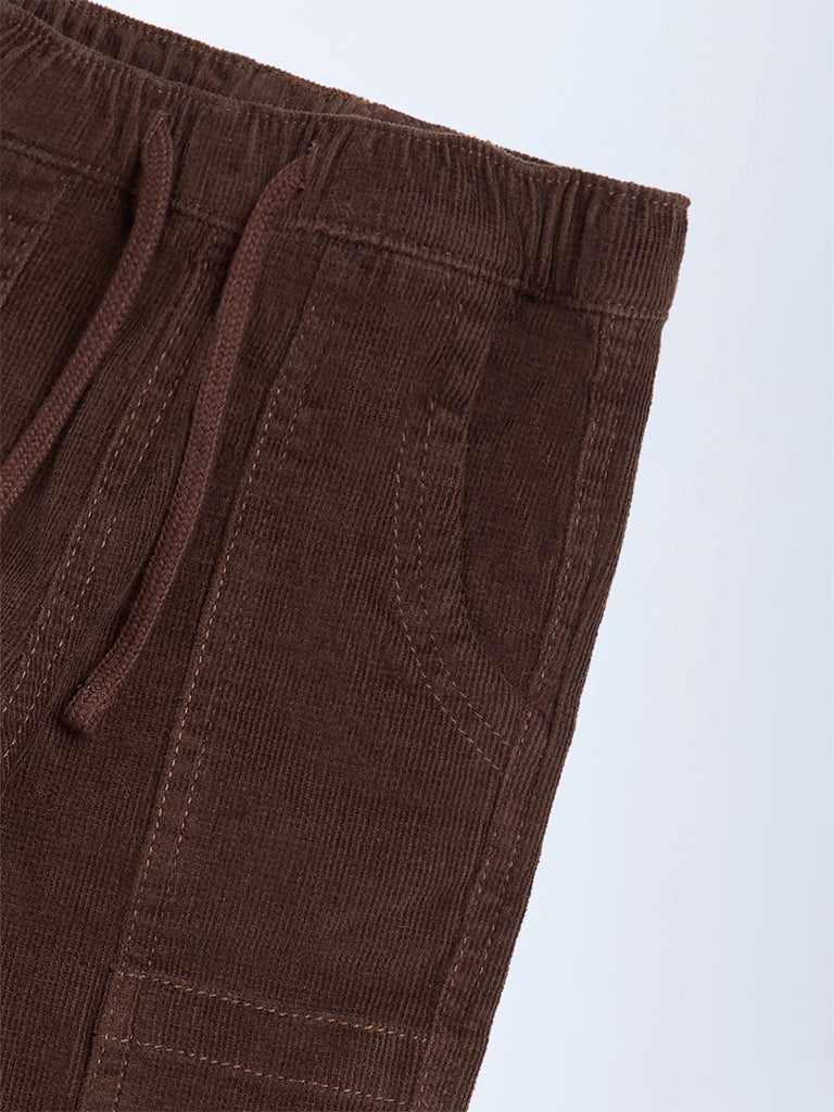 HOP Kids presents these dark brown corduroy joggers designed for comfort and everyday ease. Crafted from cotton-blend fabric. they feature multiple utility pockets for a functional design. The mid-rise waist is fitted with an elasticated drawstring for an adjustable fit. while the cuffed edges ensure a snug finish through active days.