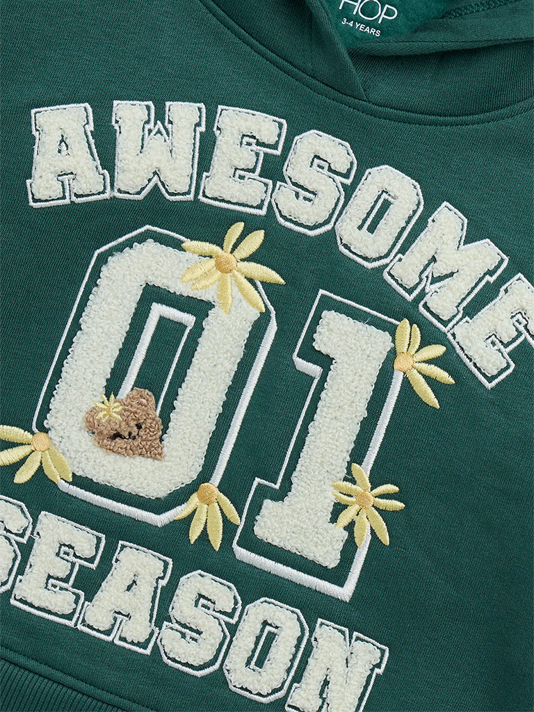 This dark green sweatshirt from HOP kids highlights embroidered text designs at the front. Made from a cotton-blend fabric. it features a hood and full sleeves for a sumptuous feel.