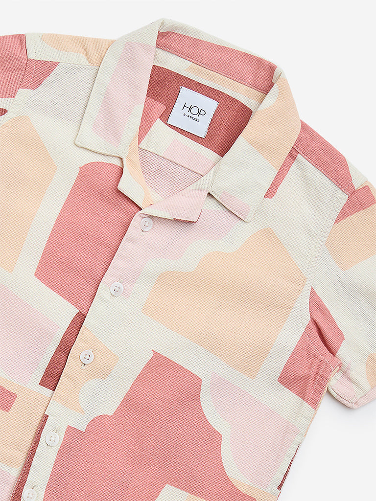 HOP Kids presents this dusty pink shirt. crafted from a soft cotton fabric for all-day comfort. Showcasing abstract patterns for a modern touch. it features a classic camp collar. a button-up front. and short sleeves.