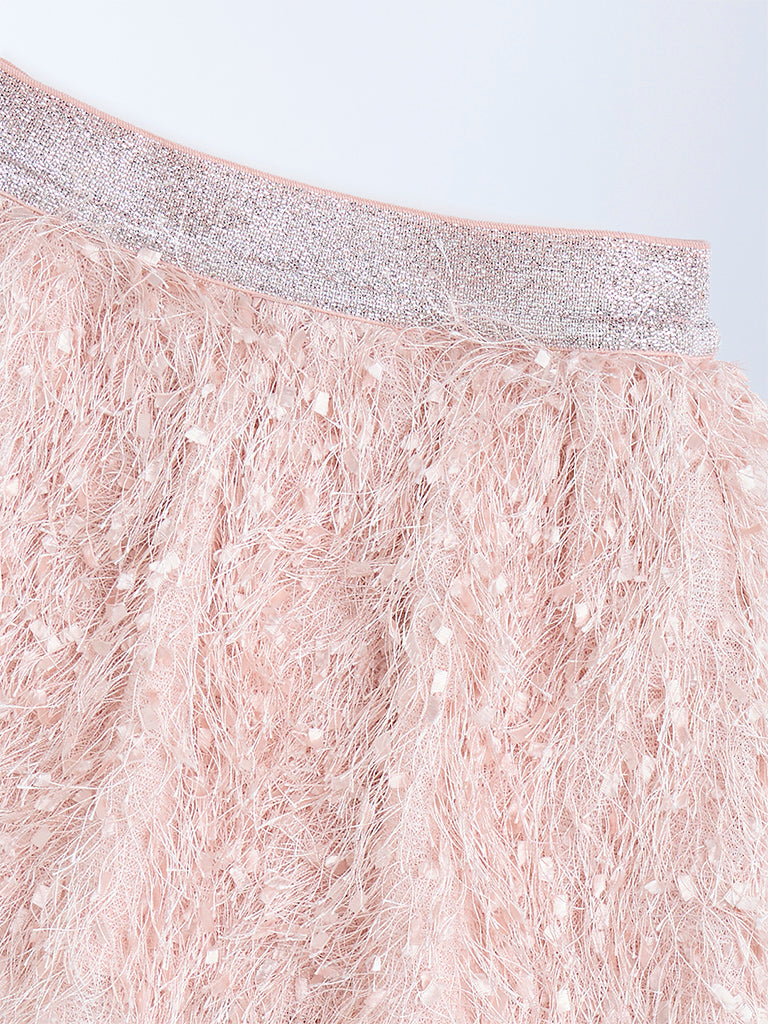 HOP Kids introduces this dusty pink skirt. styled in a high-rise silhouette with a glittering elastic waistband for a secure fit. Crafted from smooth. sumptuous fabric. it features a fur-textured surface that lends a soft. dressy appeal. A charming choice for festive occasions. it blends comfort with standout style.