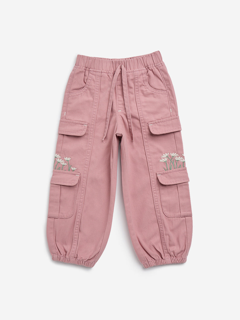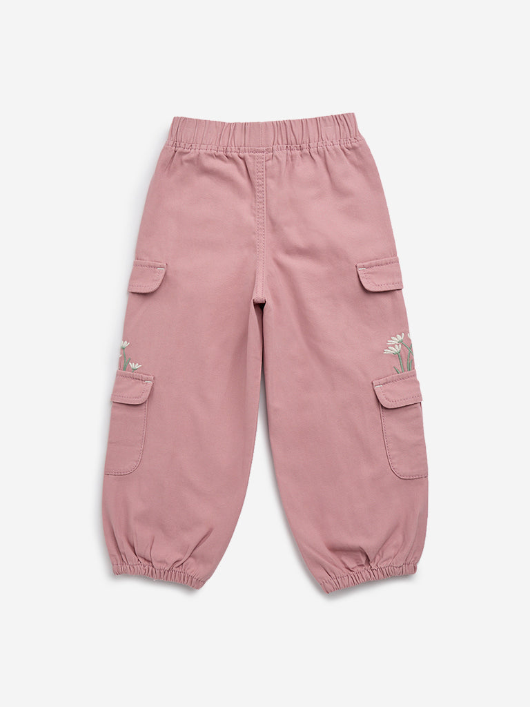 These dusty pink joggers from HOP Kids feature charming floral embroidery on the legs. Designed in a cargo style. they come with multiple pockets. an elasticated waistband with drawstrings. and cuffed hems for a comfortable and stylish fit.