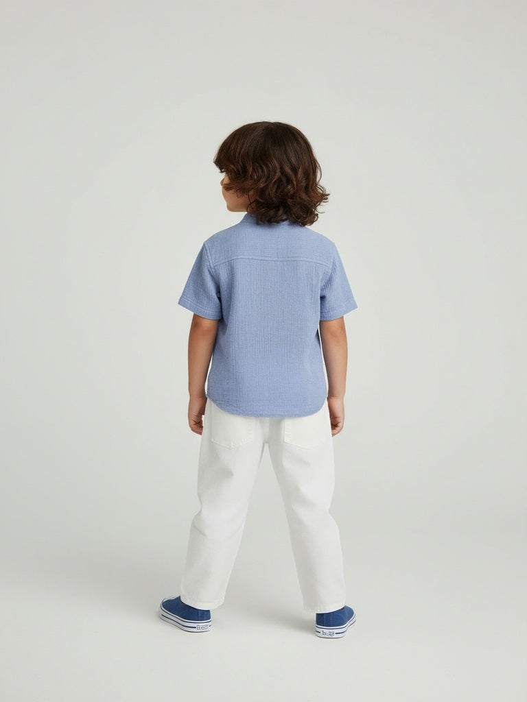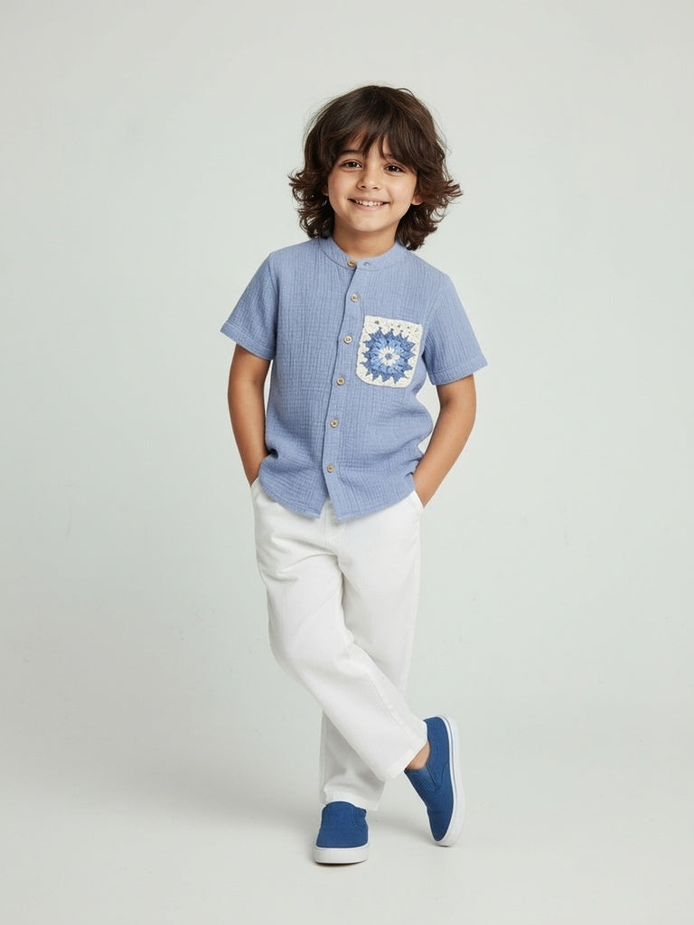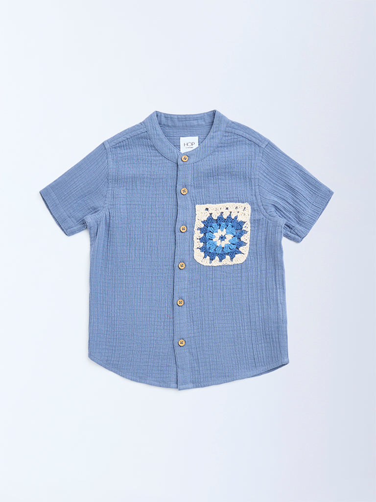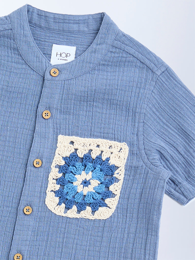 A breezy staple for warm days. this dusty blue shirt from HOP Kids is spun from a crinkle-textured fabric that keeps him cool and comfy. Designed with a mandarin collar. button placket. and short sleeves. it’s finished with a crochet pocket on the chest for a playful twist.