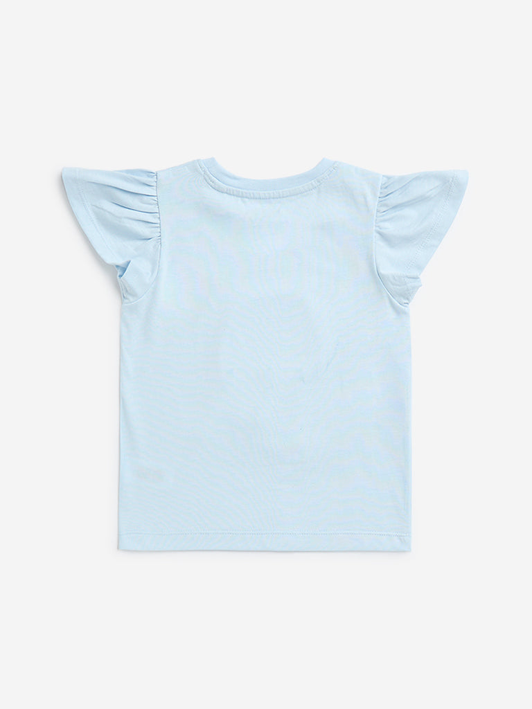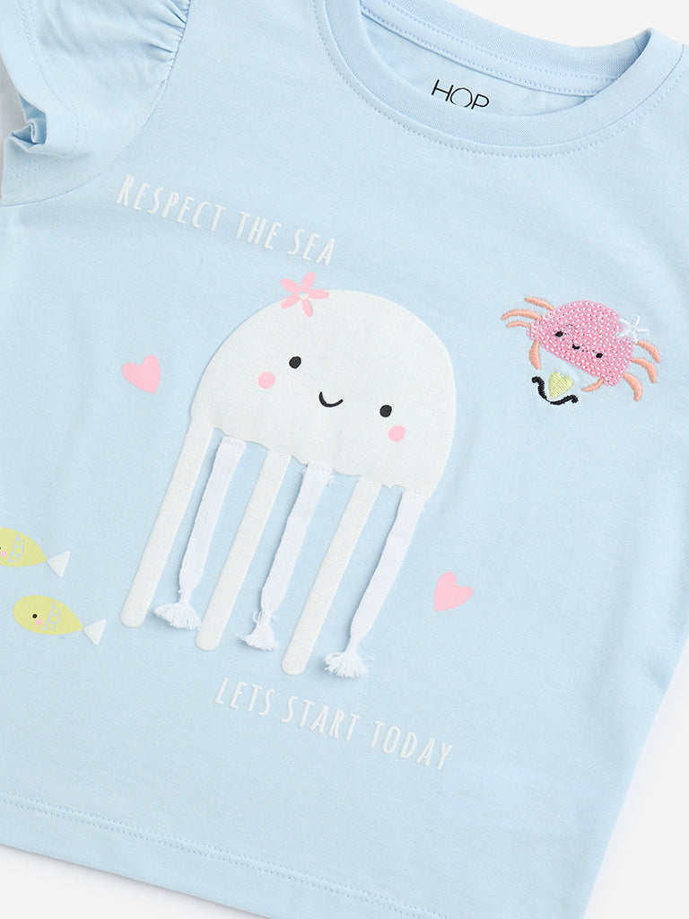 Made from pure-cotton. this light blue t-shirt from HOP Kids flaunts adorable jelly prints at the front. It is designed with a round neck and ruffled sleeves.