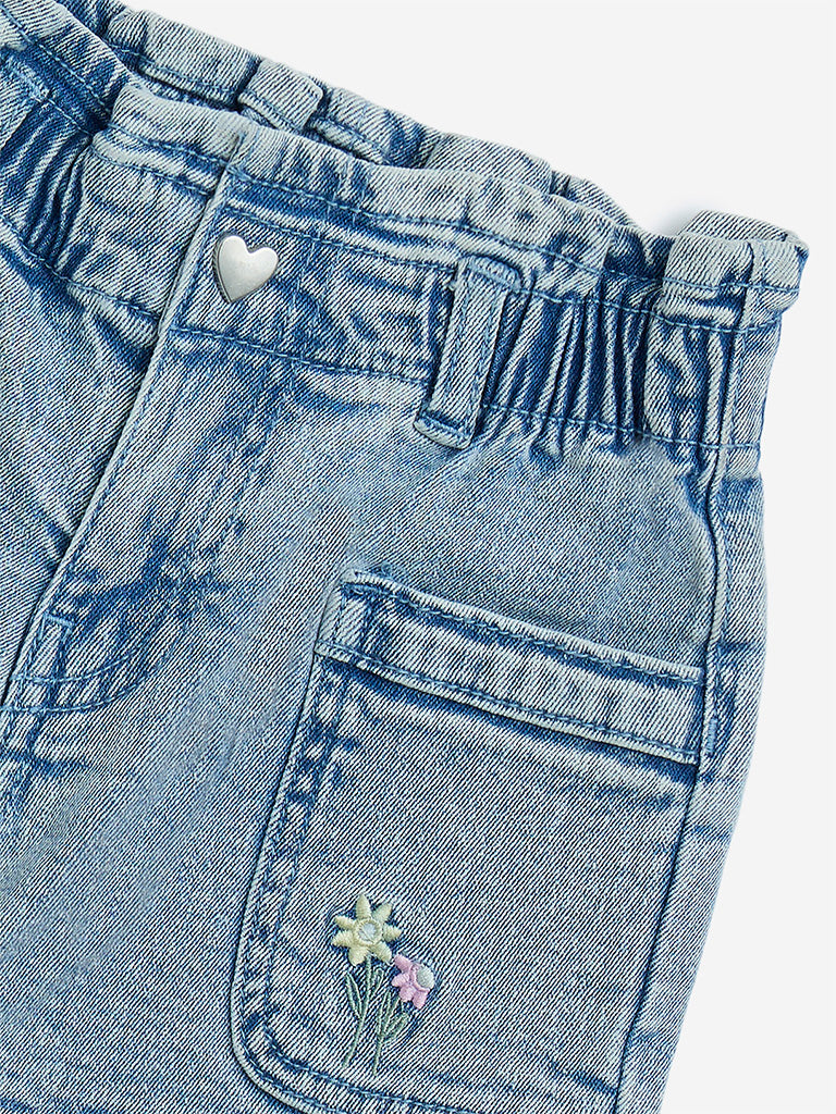 These light blue denim shorts from HOP Kids bring a fresh and playful vibe to sunny-day dressing. Made from pure cotton. they feature a mid-rise fit with a ruffled buttoned waistband and a classic zipper fly. Floral embroidery and multiple pockets add the perfect mix of charm and function.
