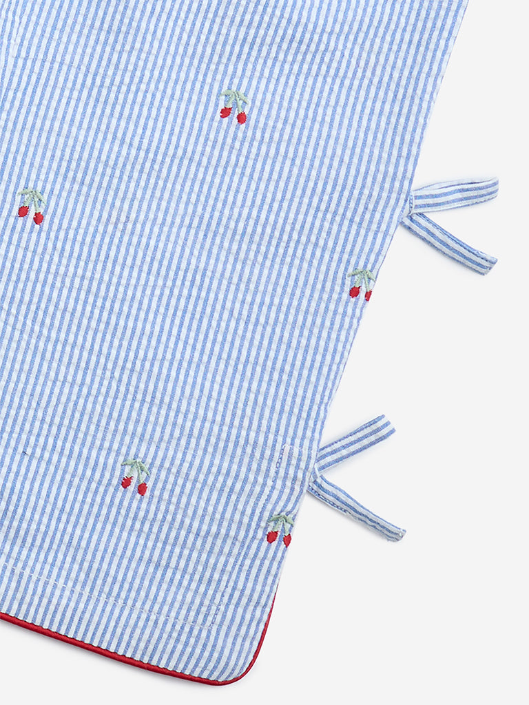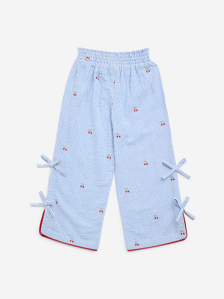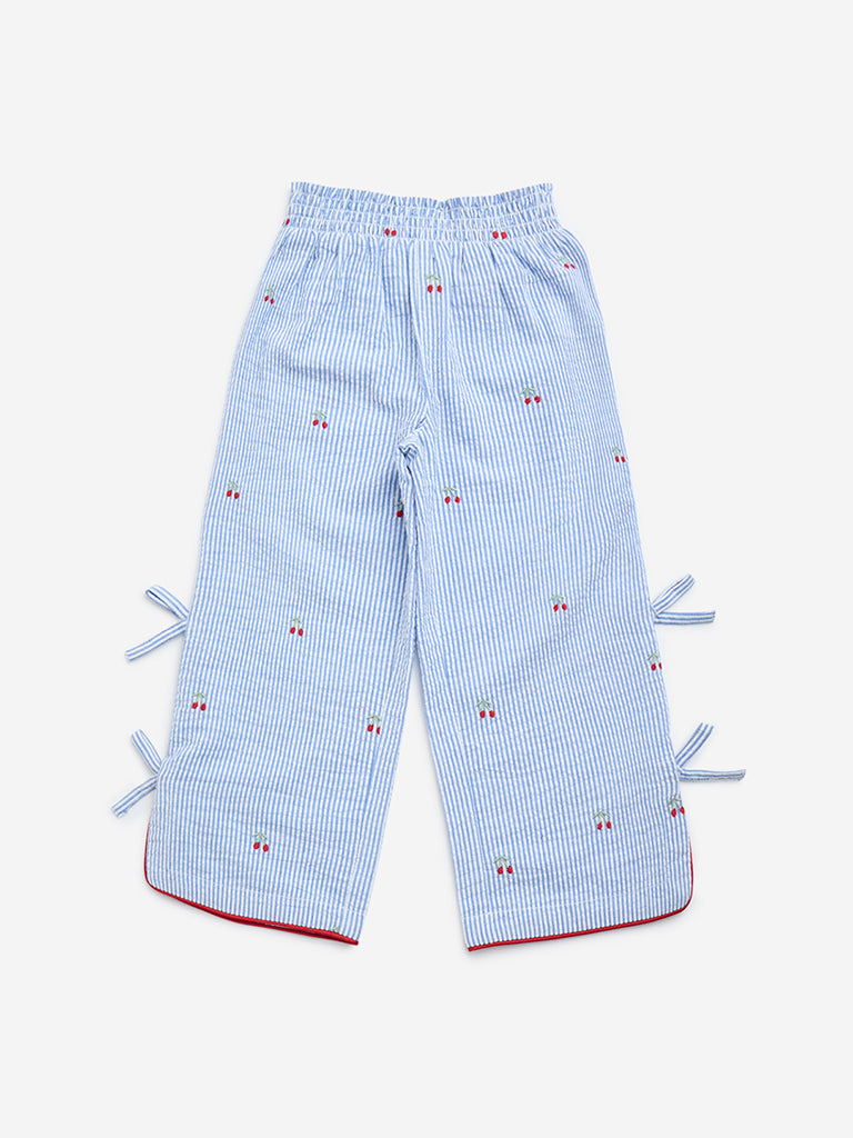 These light blue pants by HOP Kids are designed with a striped pattern and feature cherry motifs along with bow details for a playful touch. It is milled from pure cotton material and includes an elasticated waist. providing a comfortable and adjustable fit.