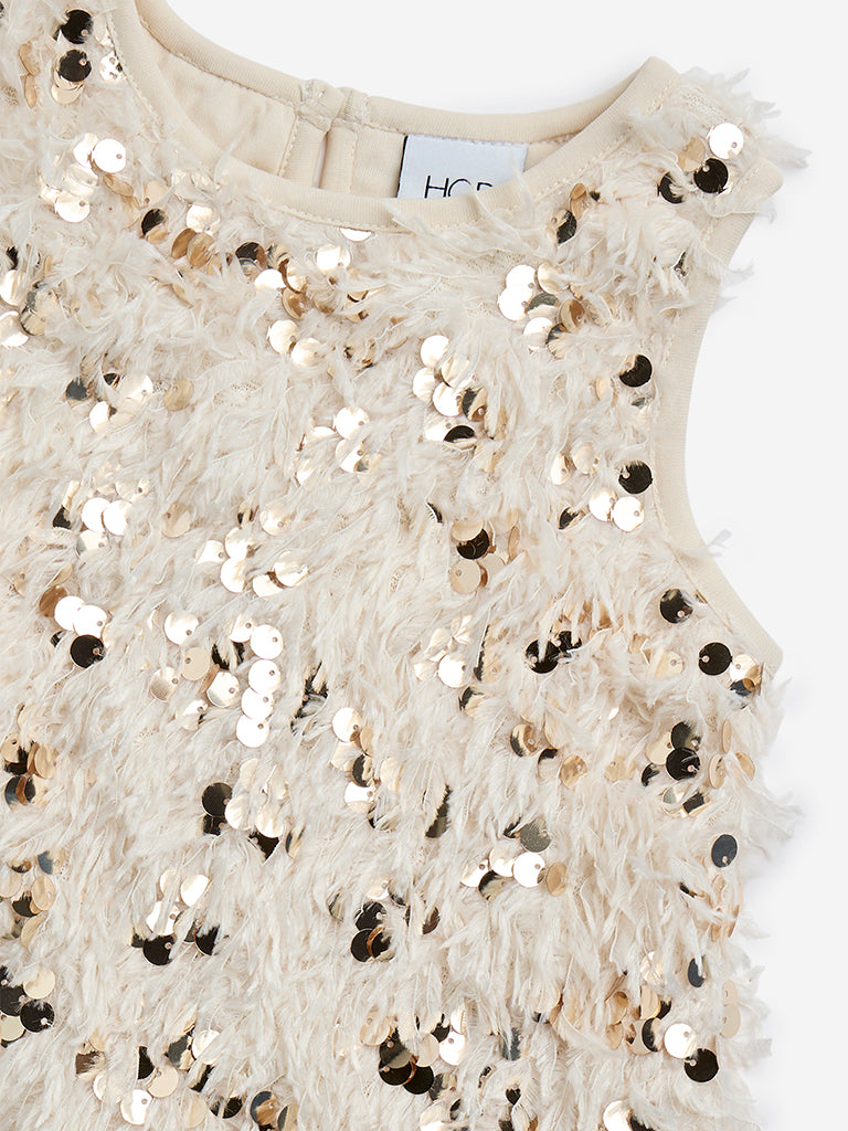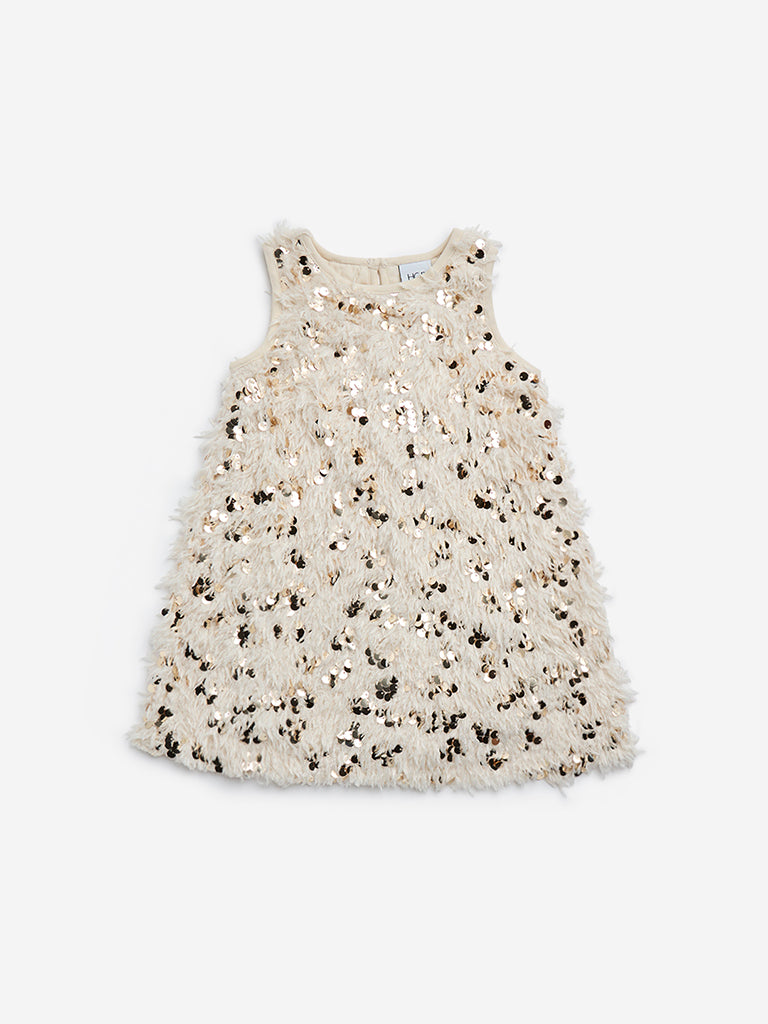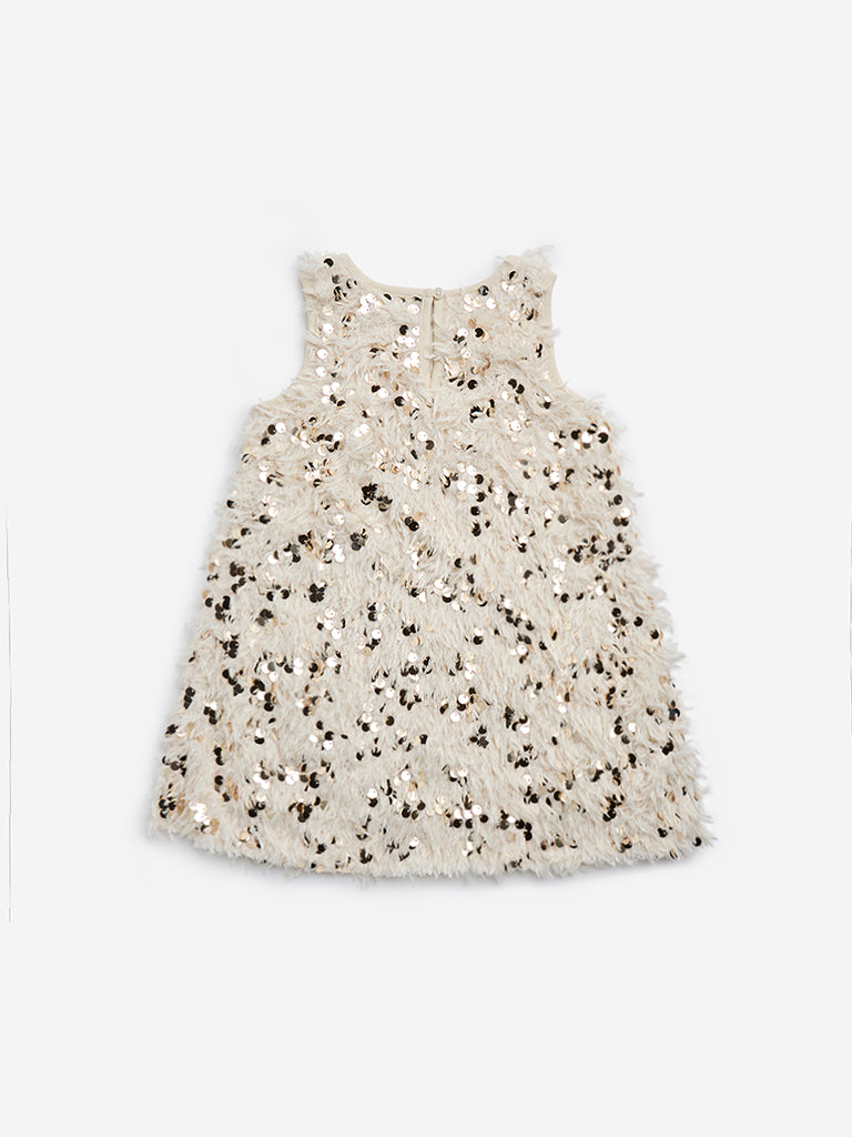 This light gold dress from HOP Kids is designed with a faux-fur finish. Showcasing sequin designs. the A-Line separate is fitted with a round neck and sleeveless design.
