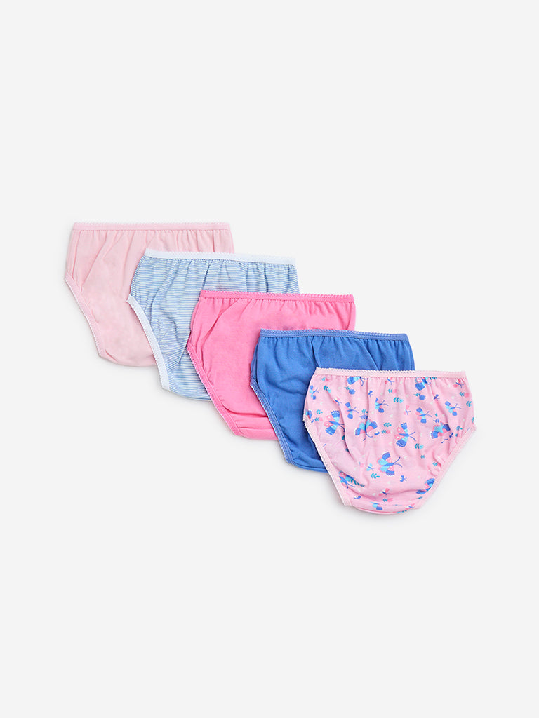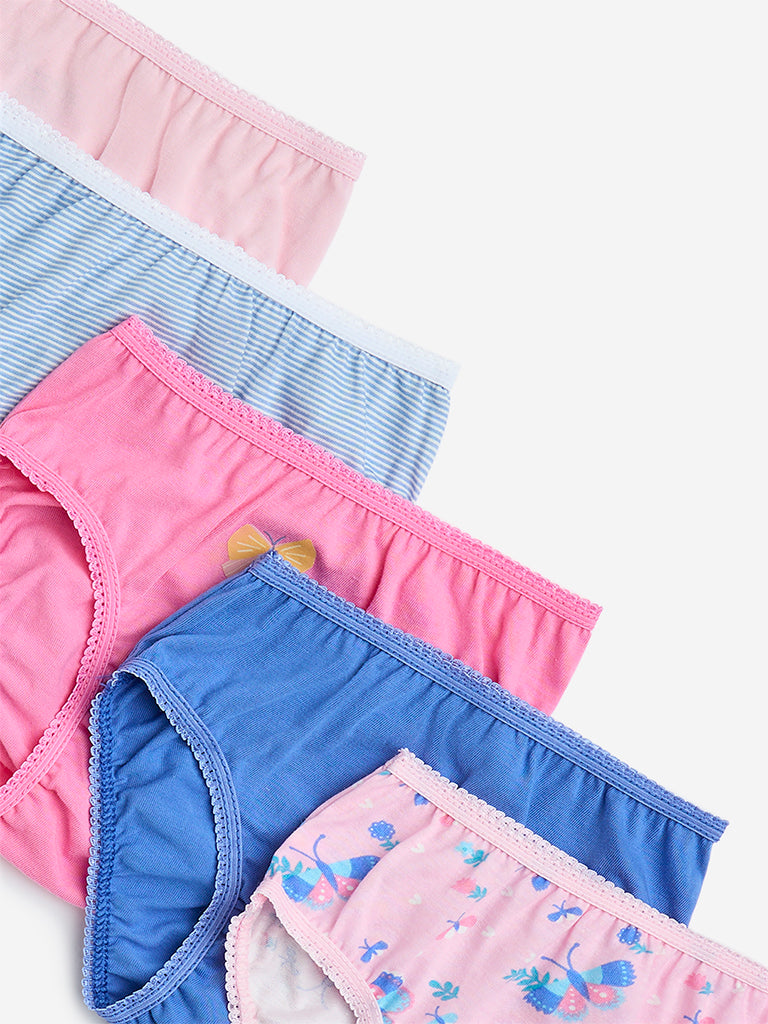 This set of five briefs from HOP Kids comes in a charming mix of light pink and blue shades. featuring striped. solid. and butterfly-printed designs. Crafted from ultra-lightweight fabric. they provide all-day comfort with a soft elastic waistband for a secure and gentle fit.