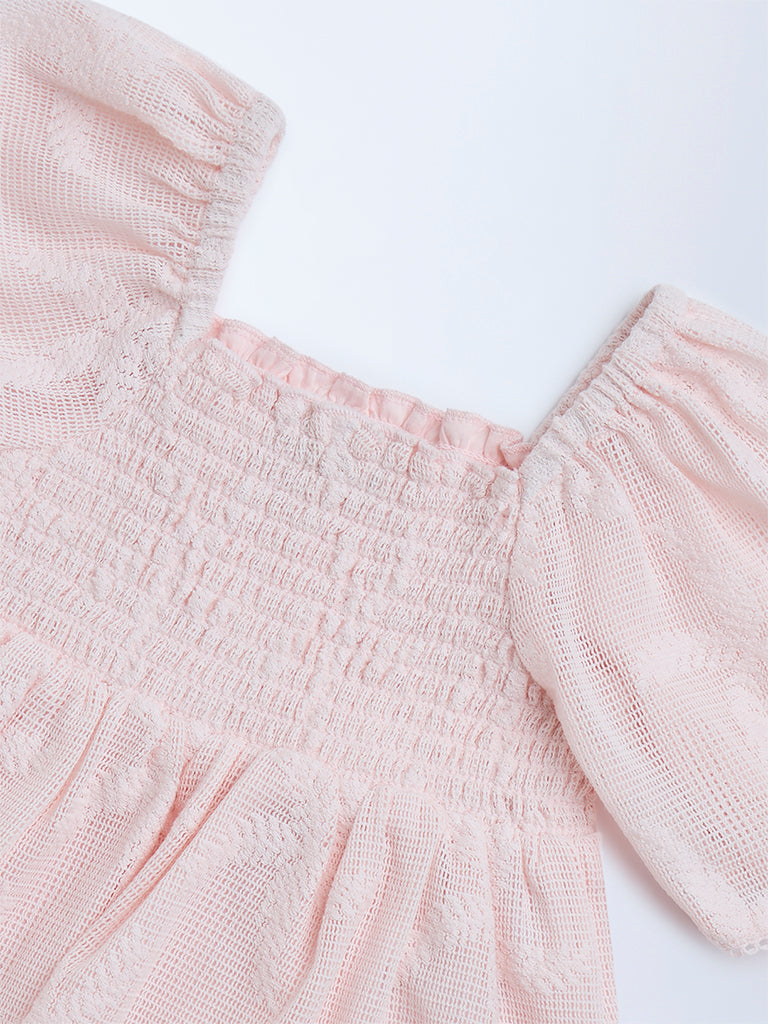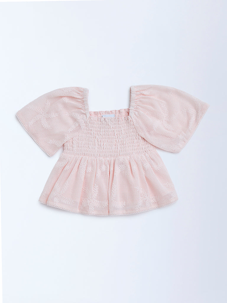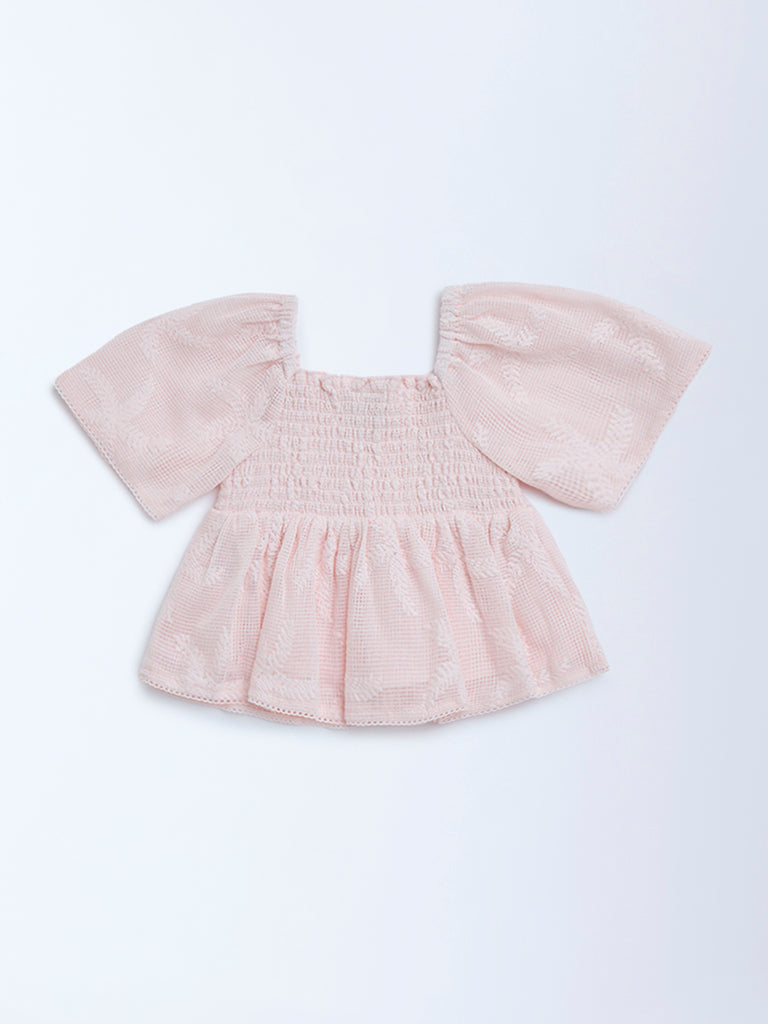 Perfect for party time or dress-up days. this light pink top from HOP Kids is made from a textured cotton-blend fabric with intricate leaf embroidery. The smocked bodice offers a flexible fit. while the square neck and voluminous puff sleeves add a playful charm.