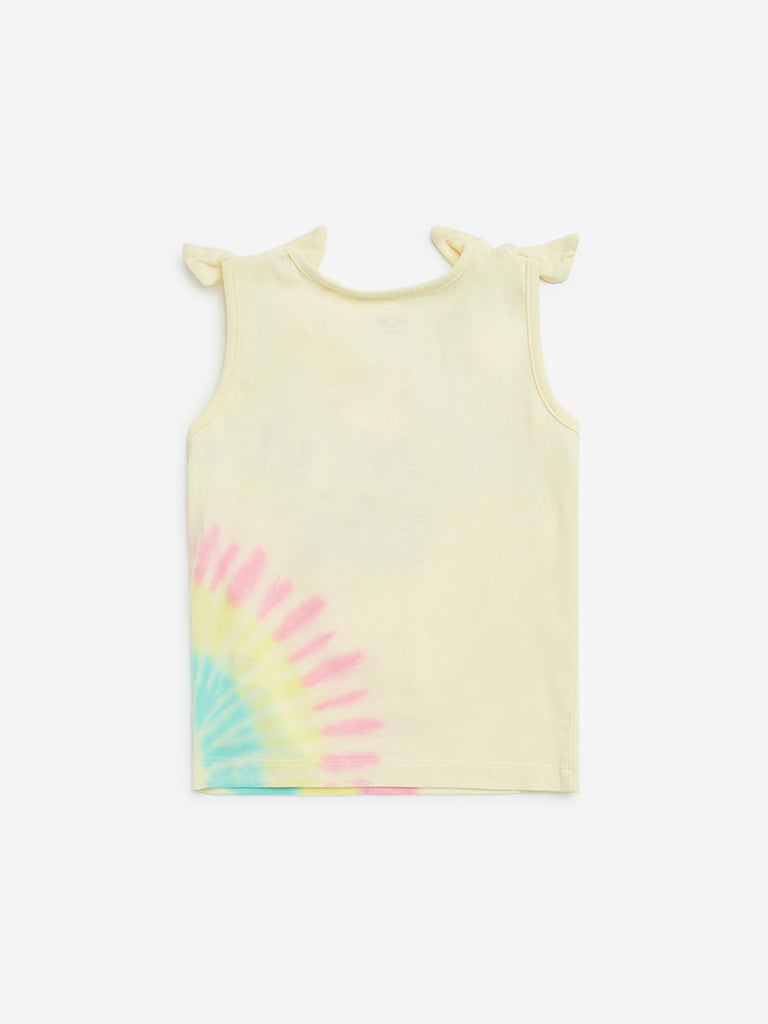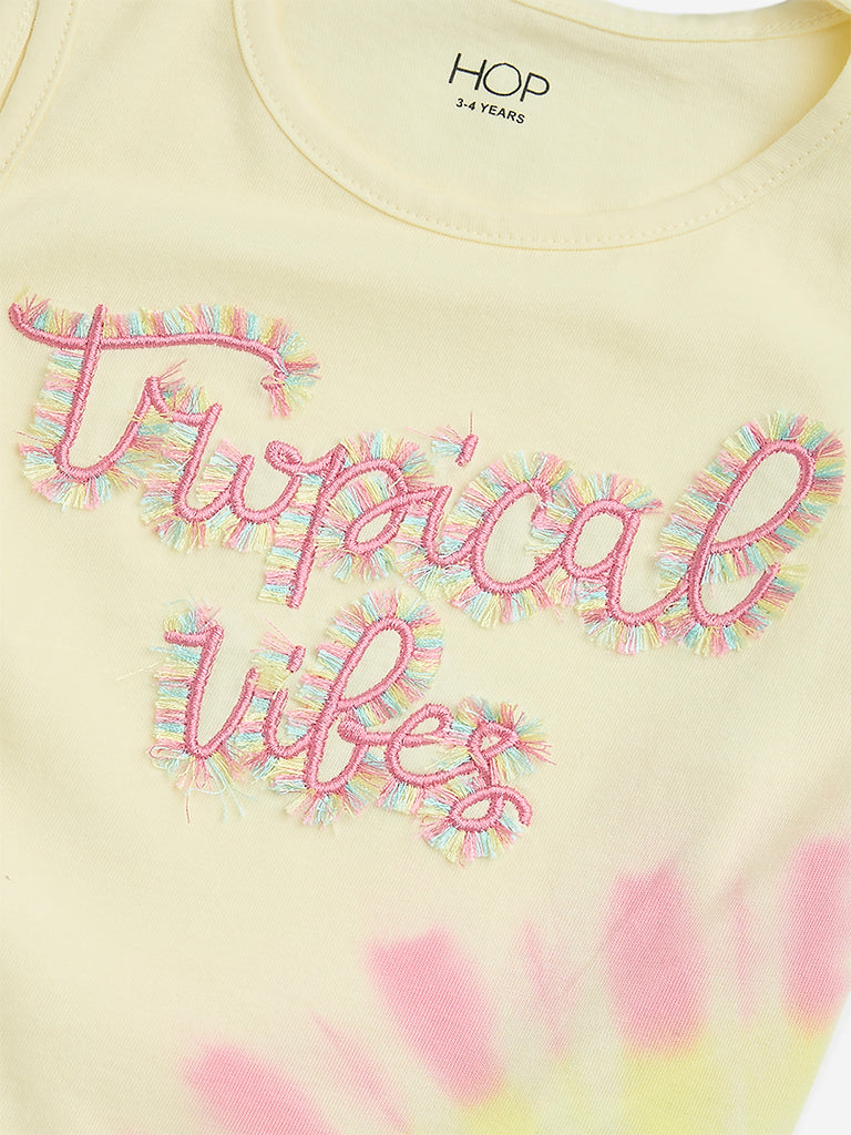 HOP Kids introduces this light yellow top. featuring text embroidery on a tie-dye design. Crafted from cotton-rich fabric. it is designed with a round neck and tie-up details on the straps. offering a playful and comfortable selection to your little one’s wardrobe.
