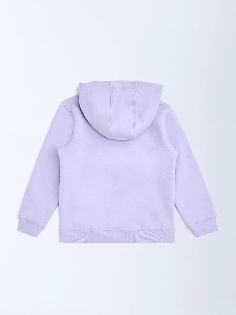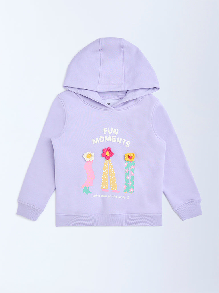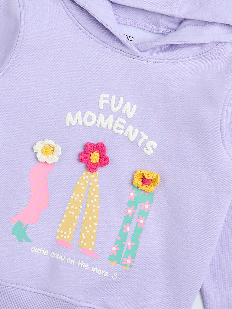 This lilac hoodie from HOP Kids is crafted from a soft cotton-blend fabric. ensuring warmth and comfort all day. The front showcases floral appliques with playful text for a lively. expressive look. Complete with a hood. full sleeves and ribbed trims. it’s an easy choice for cozy. cheerful dressing.