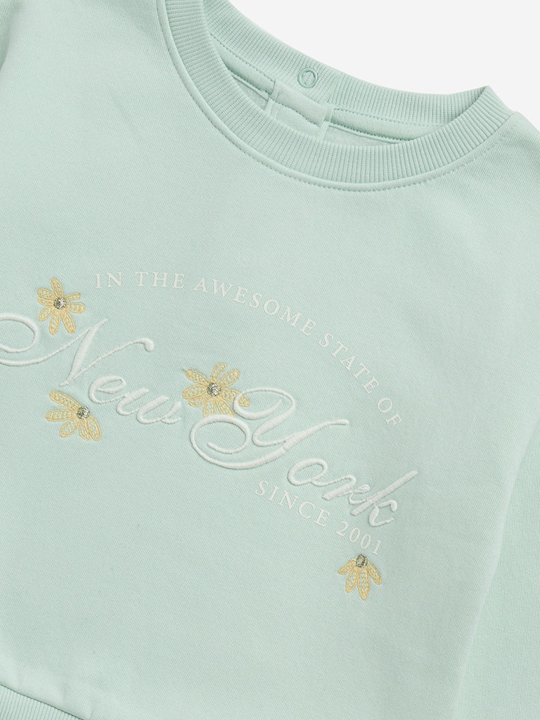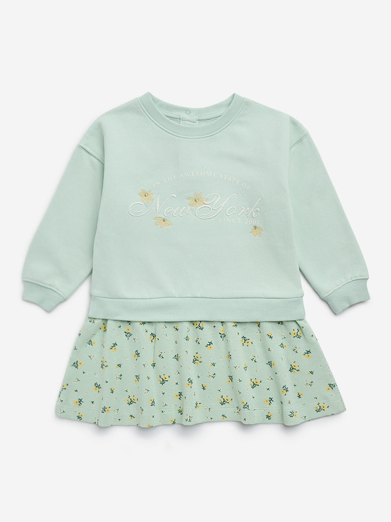 This mint dress by HOP kids is crafted from a sumptuous fabric for easy comfort. Designed with a crewneck and full sleeves. it features text prints at the front coupled with floral motifs at the bottom.