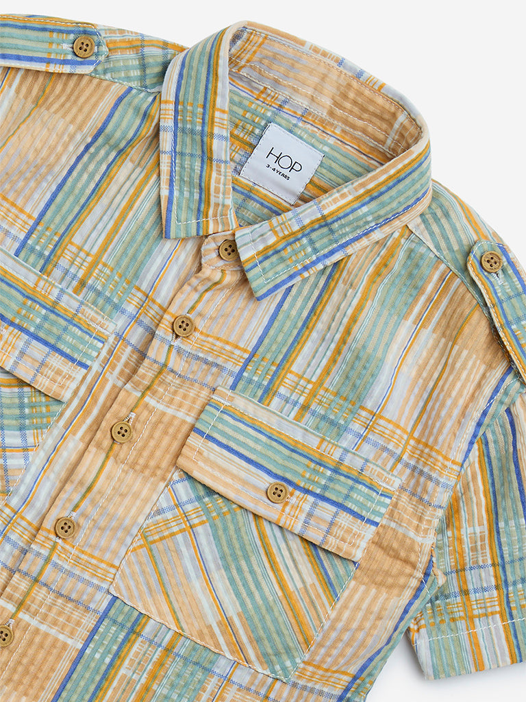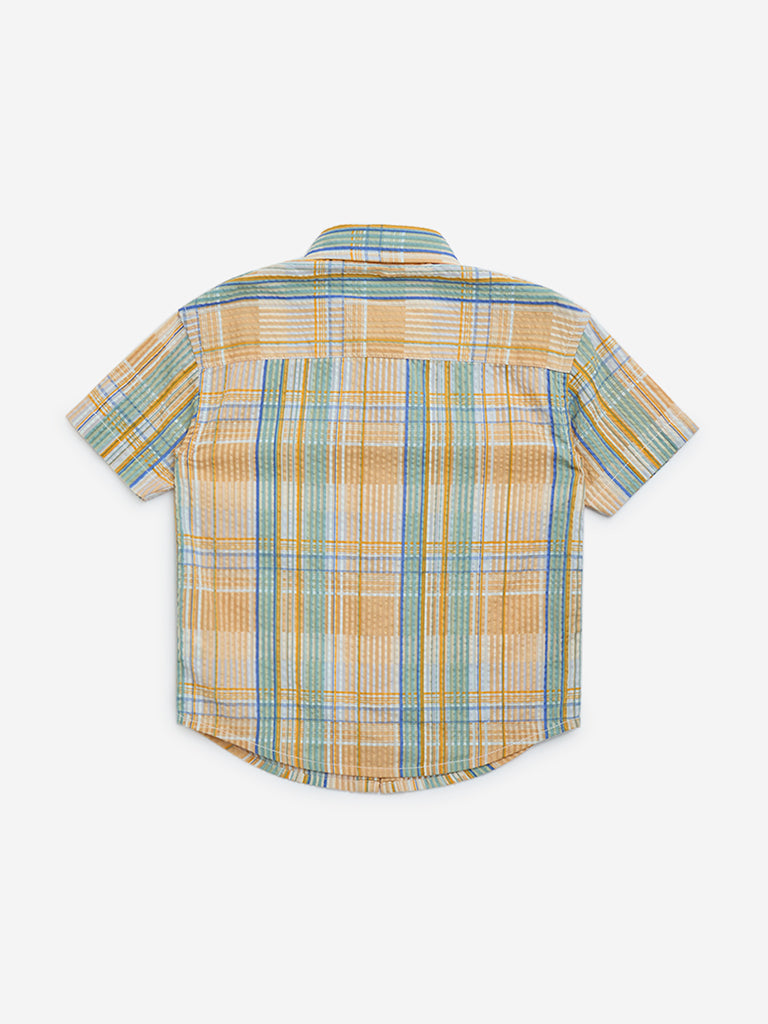 This multicolour checkered shirt from HOP Kids is milled from pure cotton with a crinkled texture that adds unique character. Featuring a classic collar. button placket. short sleeves. and two flap pockets. it strikes the perfect balance between playful style and everyday practicality.