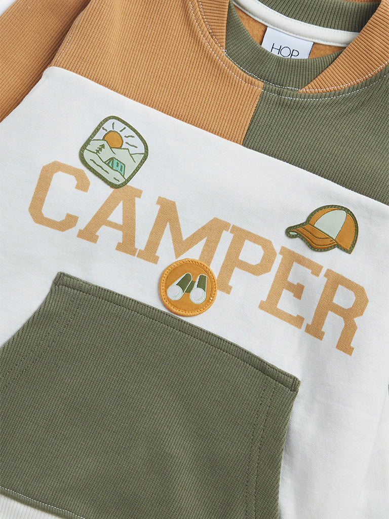 Showcasing a colour-blocked profile. this multicolour sweatshirt from HOP Kids flaunts text prints at the front. Its breathable composition ensures easy comfort. while the kangaroo pocket lends a practical finish.
