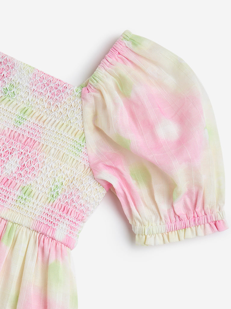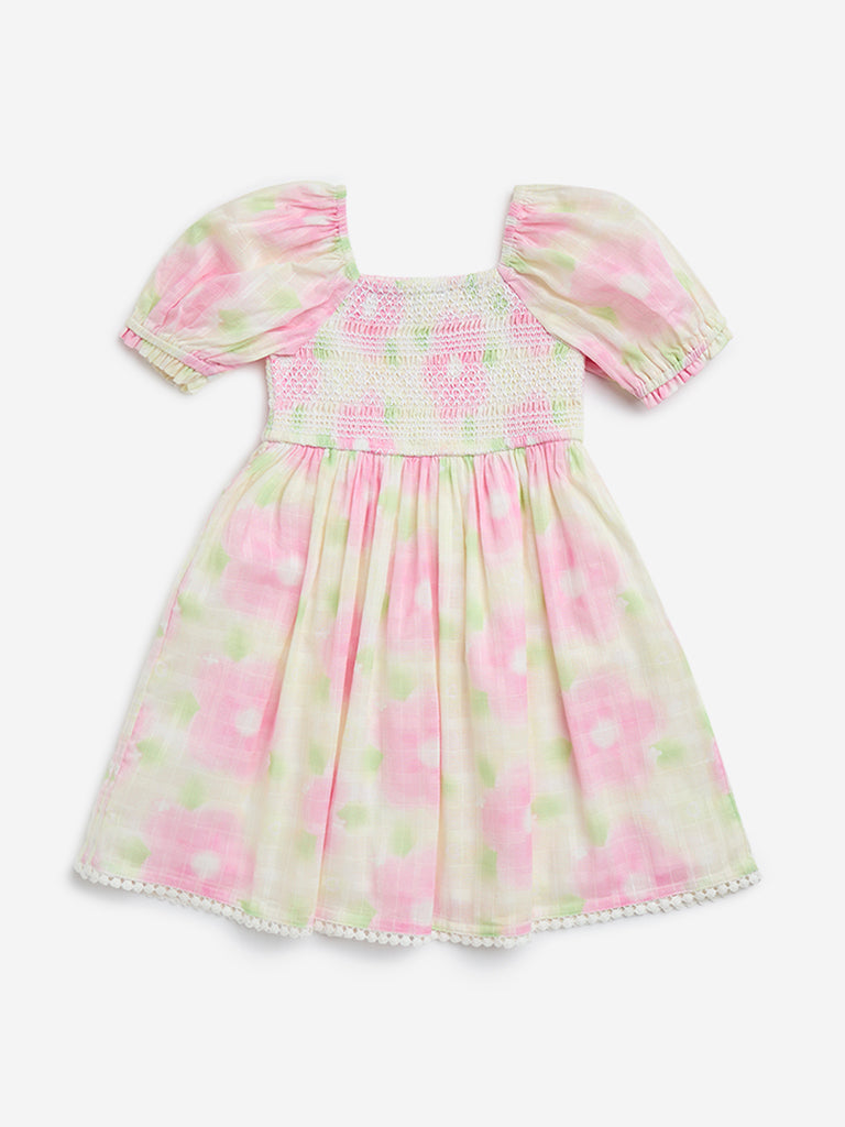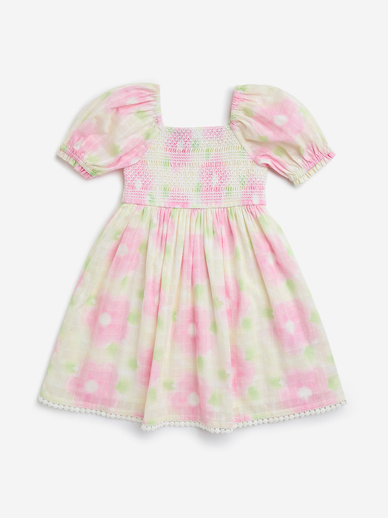 HOP Kids presents this multicolour dress showcasing elegant floral prints. Made from pure cotton. the A-line garment flaunts pom-pom detailing on its hemline. The dress is structured with a square neck. puff sleeves and a smocked bodice for a flattering fit.