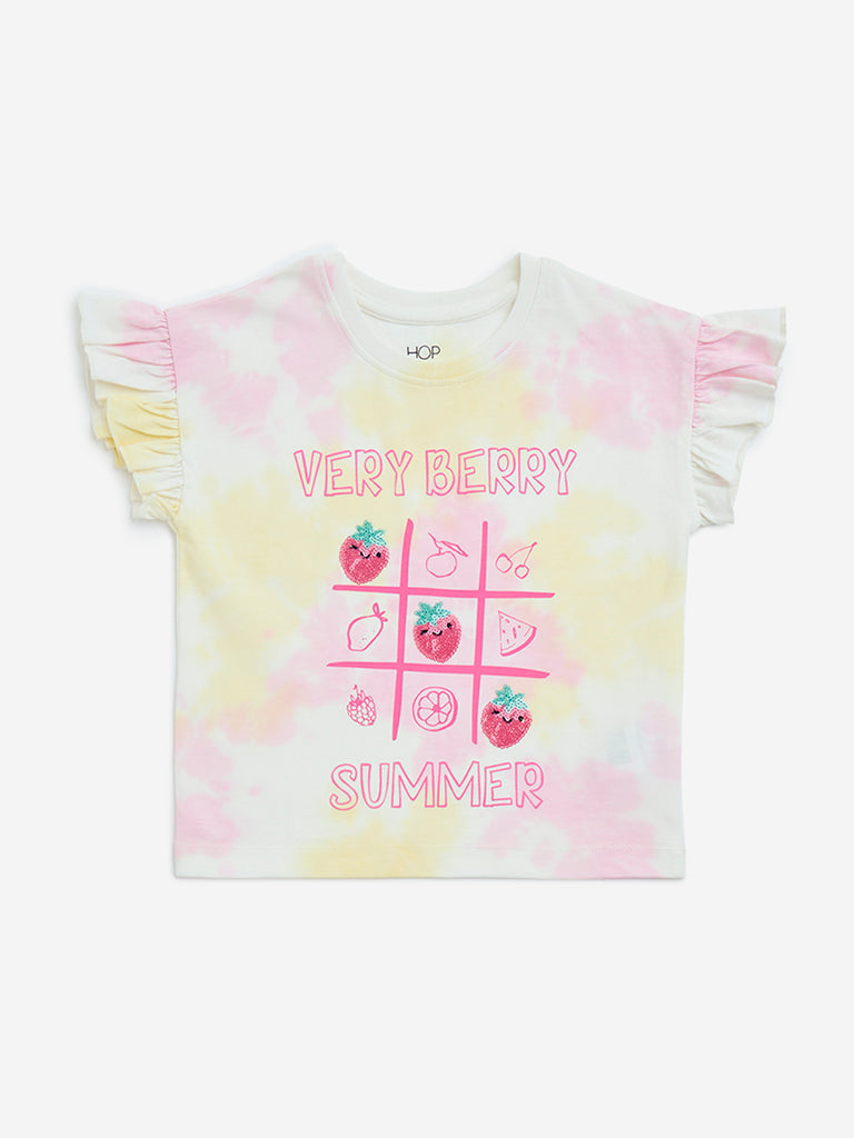 Spun from pure-cotton. this multicolour top from HOP Kids is fashioned with sequin strawberries over a tie-dye base. Styled with a round neck and ruffled sleeves. it adds a charming finish to any casual look.