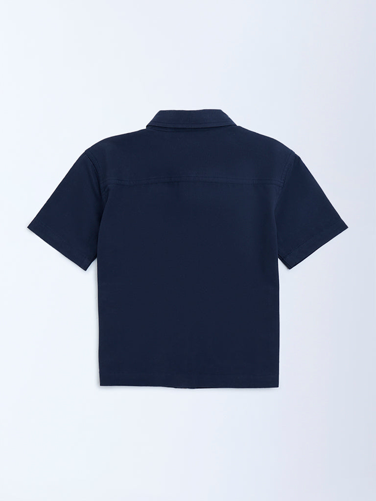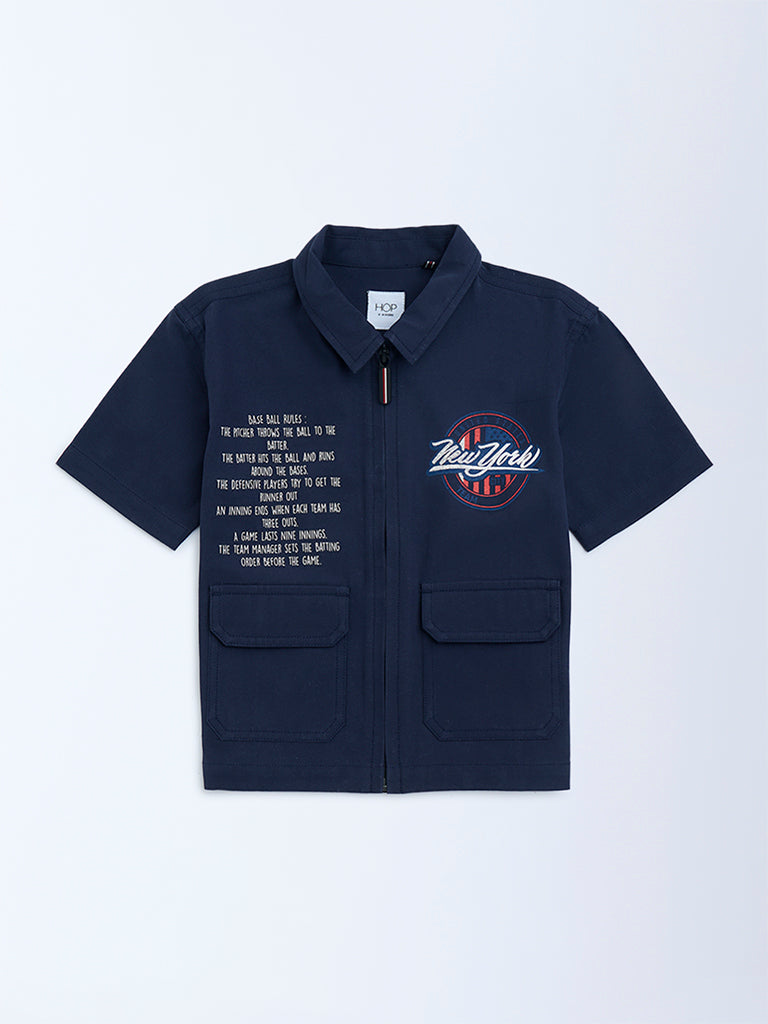 For little explorers who like a touch of cool. this navy shirt by HOP Kids makes dressing up feel effortless. The playful text prints keep it fun. while the straight-point collar. zipper front. and patch pockets add a structured twist. Cut from pure cotton. it’s perfect for family outings or those picture-ready moments where comfort still matters.