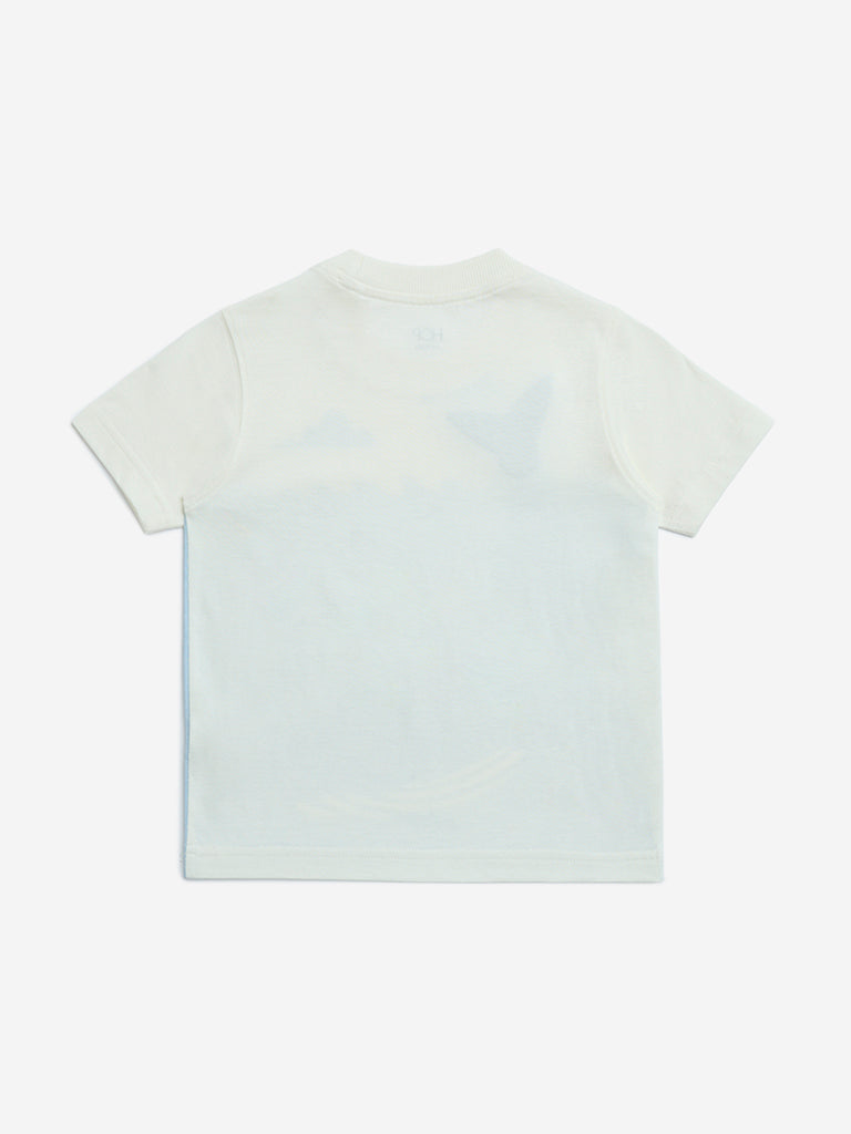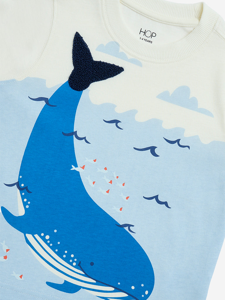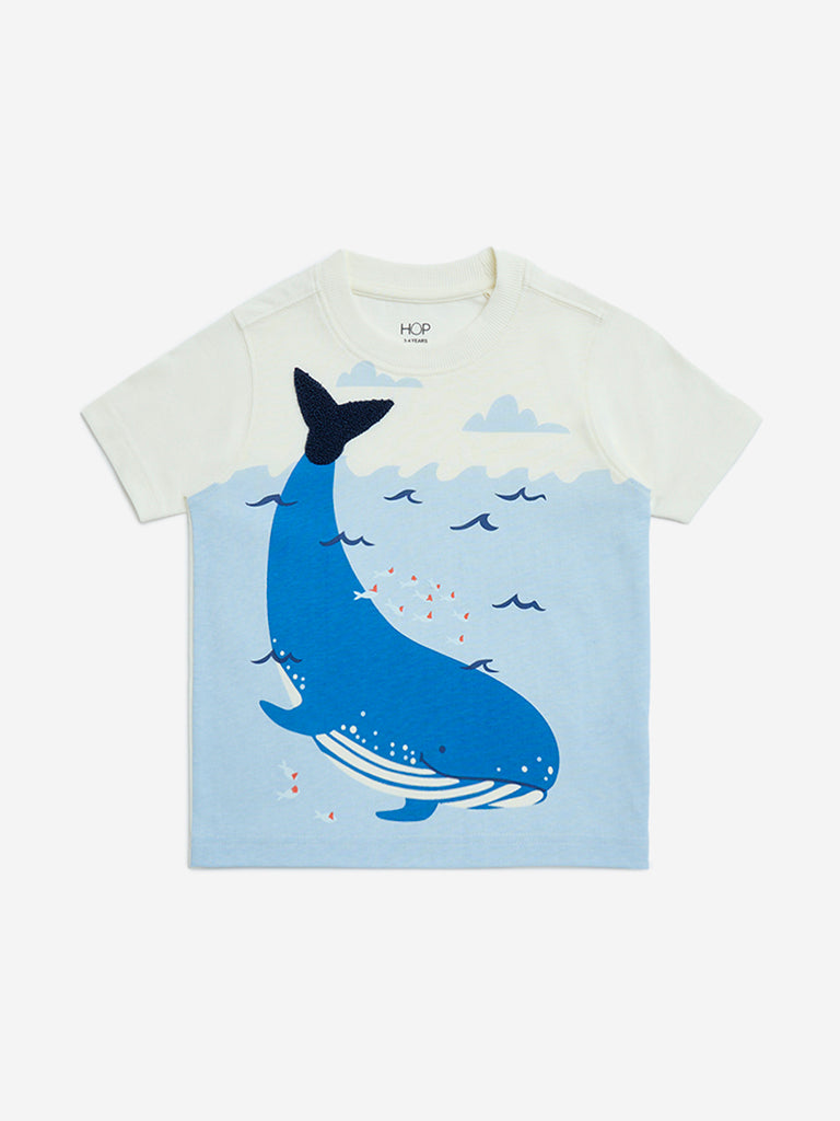 Make everyday dressing playful with this off-white t-shirt from HOP Kids. Crafted from pure cotton for a soft. breathable feel. it features a cheerful blue whale print that adds a fun. ocean-inspired touch. The ribbed crew neck and short sleeves ensure a comfy fit. perfect for all their little adventure.