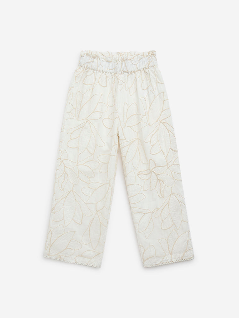 Spotlighting floral embroidery. these off-white pants from HOP Kids bring a charming touch to everyday wear. Milled from a soft cotton-blend fabric. the high-rise design features a smooth elastic waistband for a comfortable fit and functional pockets for added convenience.