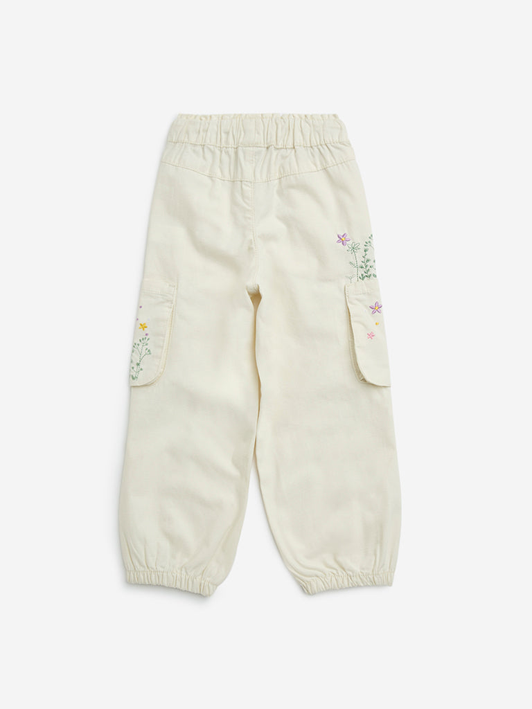 These off-white joggers from HOP Kids are created from pure cotton for all-day comfort. Delicate floral embroidery adds a charming touch. while the elasticated drawstring waistband offers a customizable fit. Multiple pockets enhance practical utility.