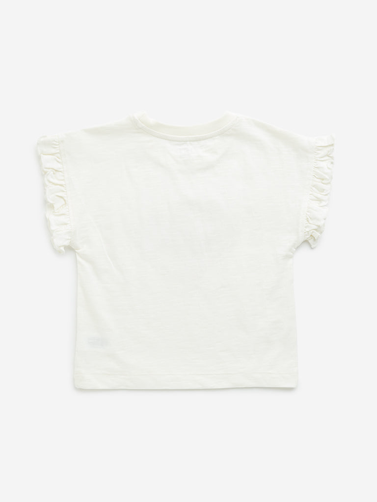 This off-white t-shirt from HOP Kids features a heart-embellished design. Crafted with pure cotton. the garment includes a round neckline and ruffled sleeves.