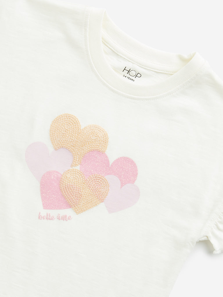 HOP Kids Off-White Heart Embellished Cotton T-Shirt