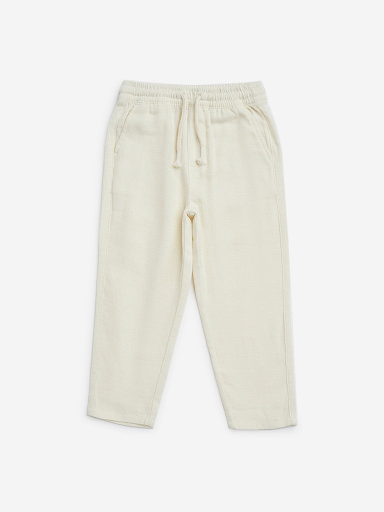 These off-white trousers from HOP Kids are crafted from a rich cotton blend for a soft and comfortable feel. Designed with a mid-rise fit. they feature an elasticated waistband with adjustable drawstrings for a secure fit. while side pockets add a practical touch.