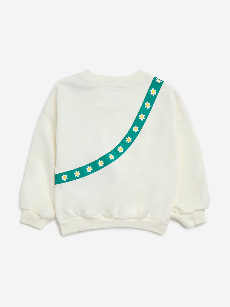 This off-white sweatshirt by HOP Kids features a green pouch with floral designs. Crafted in a pure cotton-blend. the garment boasts a round neck and full sleeves.