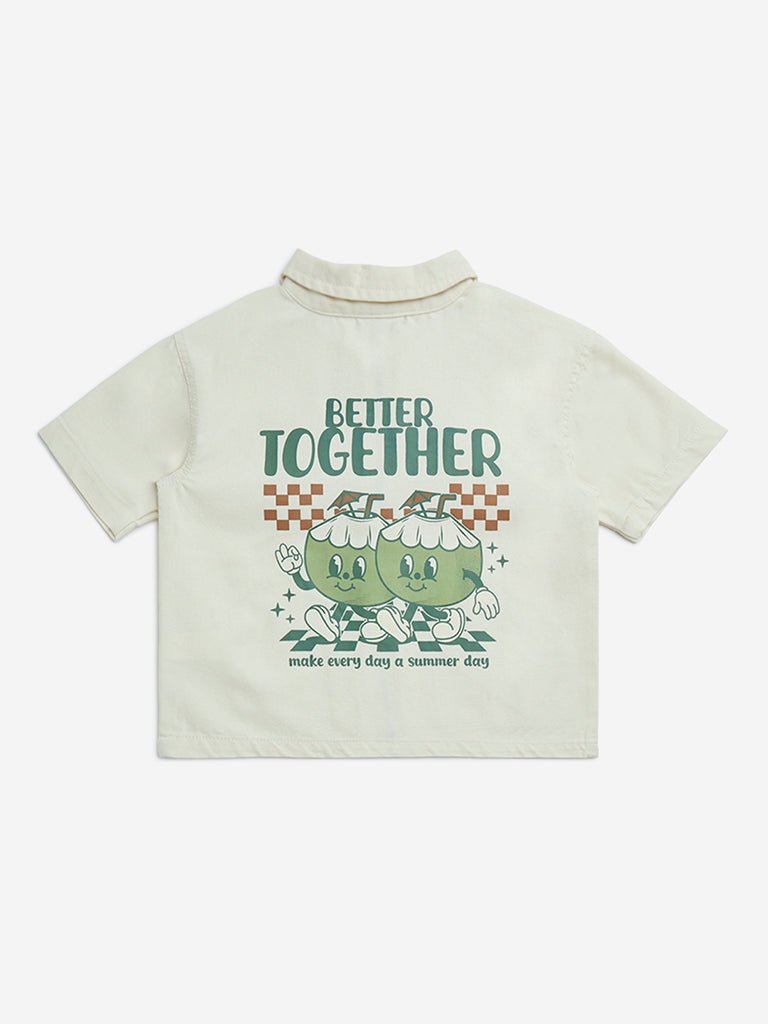 This off-white shirt by HOP Kids is a stylish and comfortable essential. Woven from pure cotton. it features a classic collar. a convenient zipper placket. and short sleeves. Eye-catching graphic prints at the back provide a trendy finish. complemented by neat welt pockets at the front for added appeal.