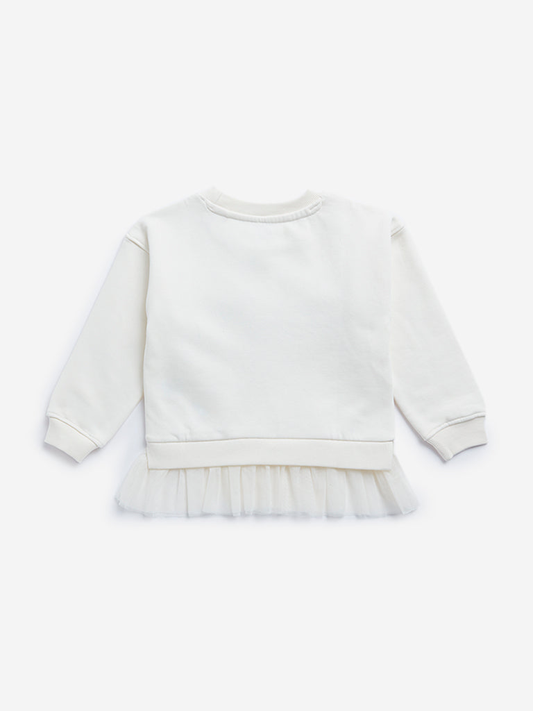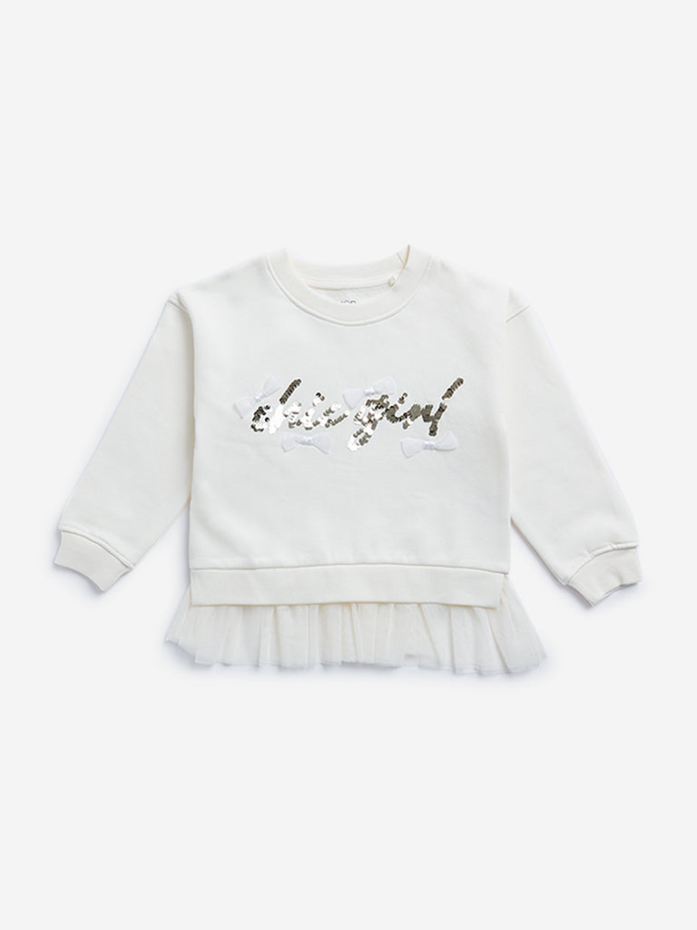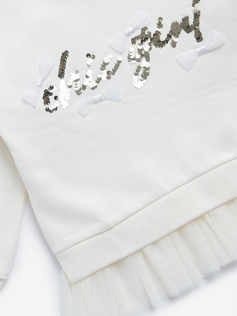 This off-white sweater from HOP Kids is decked with sequinned text designs at the front. Built from a cotton-blend fabric. it features a crew neck and full sleeves. The ruffle detailing at the hem provides a fashionable finish.