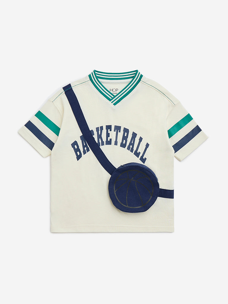 This off-white t-shirt from HOP Kids is designed for sporty charm. featuring bold text prints and a unique attached pouch with a basketball-inspired zipper closure. Crafted from a soft. cotton-rich fabric for all-day comfort. it is finished with a V-neck and short sleeves.