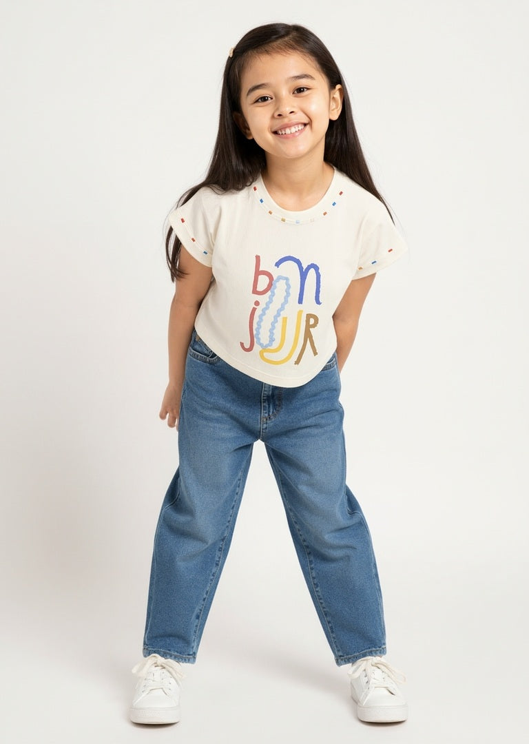 Give her casual wardrobe a cheerful makeover with this off-white t-shirt from HOP Kids. Made from a cotton-rich fabric with a cosy ribbed texture. it features vibrant text prints at the front and is finished with a crew neck and short sleeves.