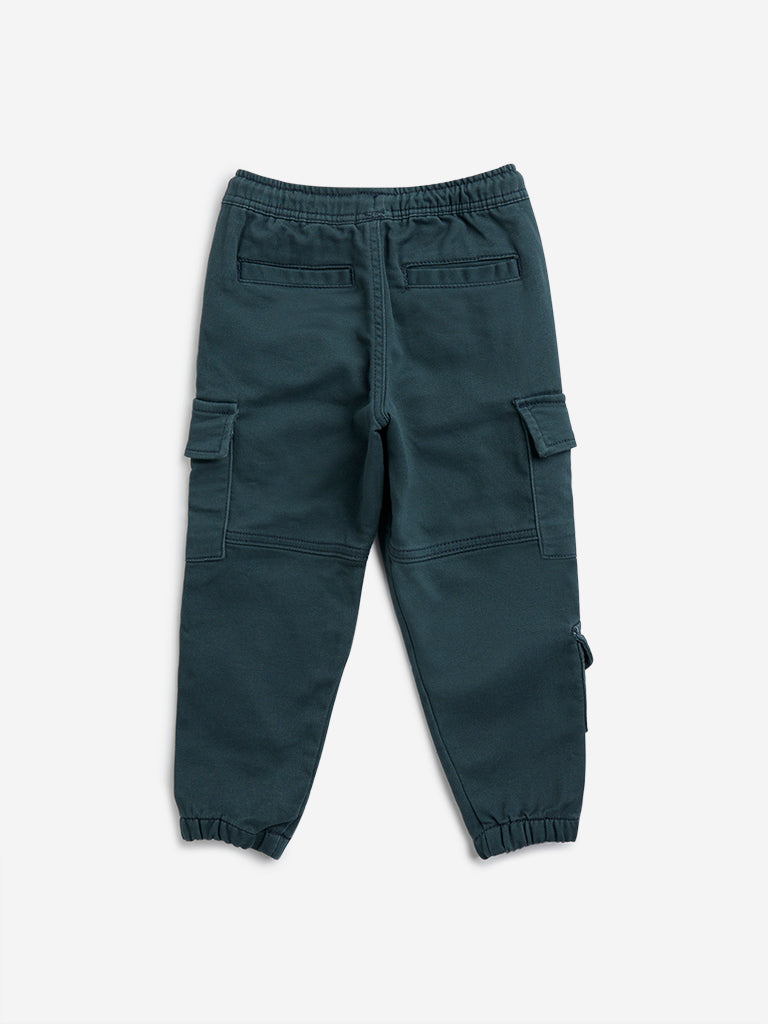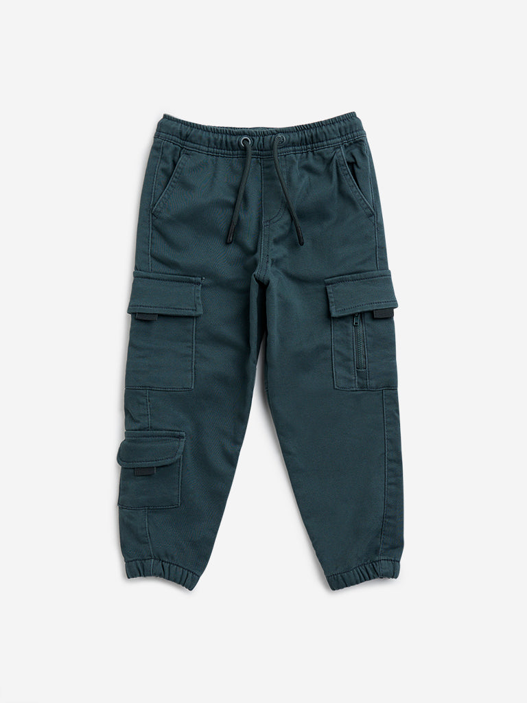 HOP Kids presents these olive cargo joggers made with soft and breathable fabric. The high-rise bottom wear features a smooth elastic waistband. adjustable drawstrings and multiple roomy pockets.