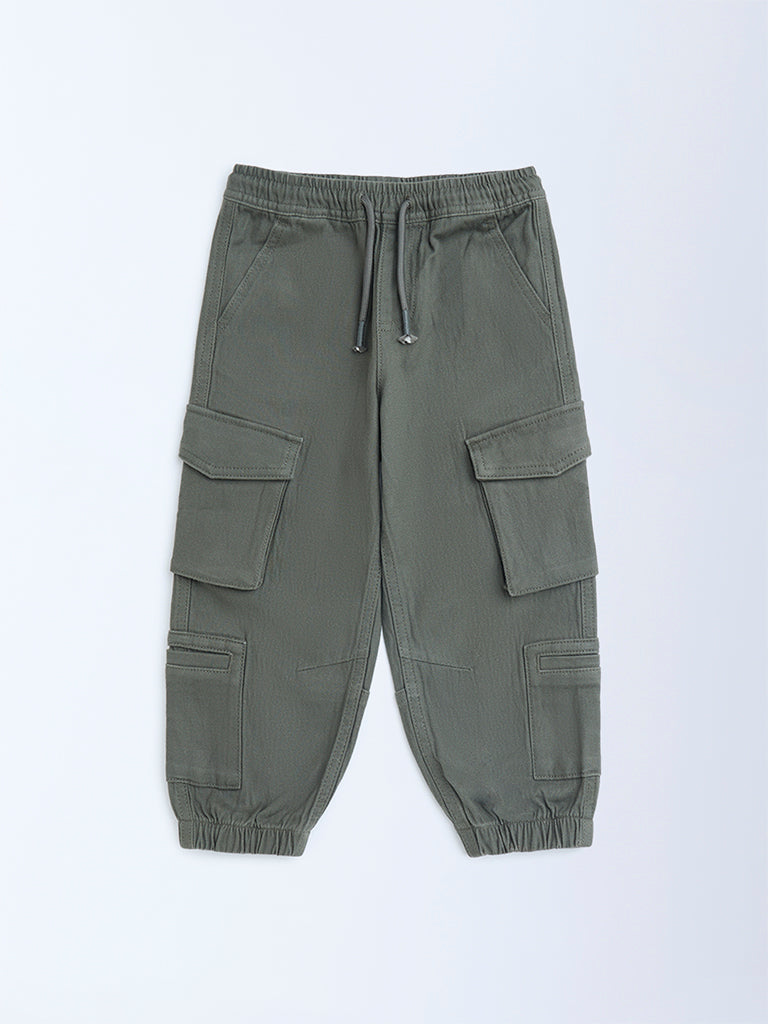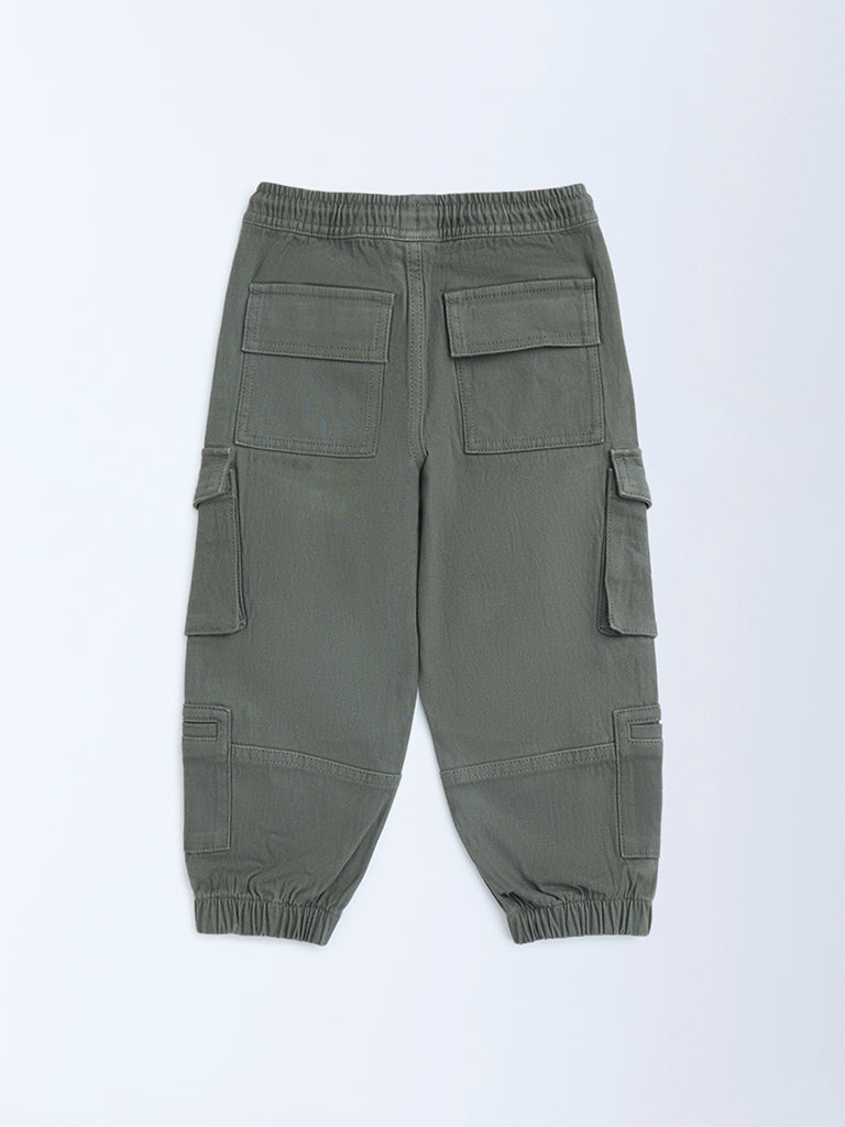 Designed for all-day comfort. these olive joggers by HOP Kids are made from a soft cotton-blend fabric. They feature multiple cargo pockets. an elasticated waistband with a drawstring. and cuffed hems for a secure fit. perfect for active. adventure-ready days.
