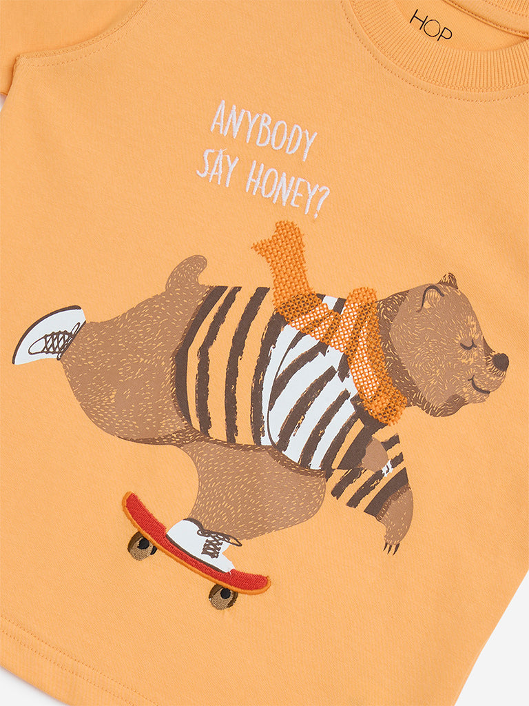 This orange t-shirt from HOP Kids is adorned with a playful bear print on the front. adding a dose of charm to your little one’s wardrobe. Constructed from cosy cotton fabric for all-day comfort. it’s designed with a classic crew neck and short sleeves for an easy fit.
