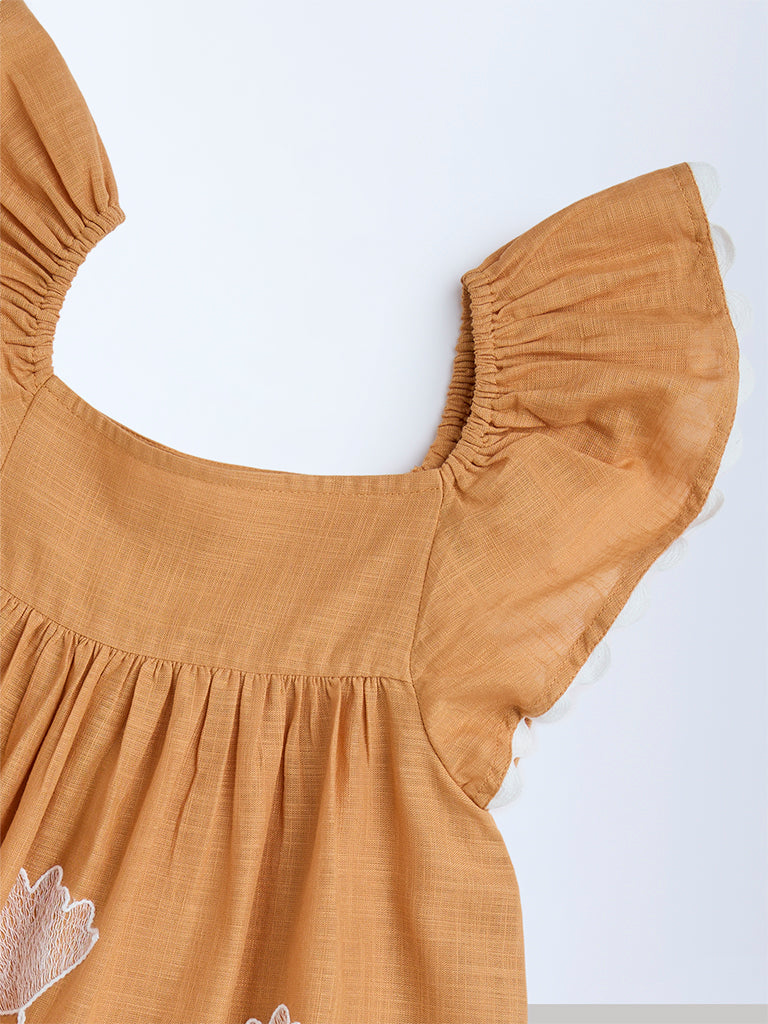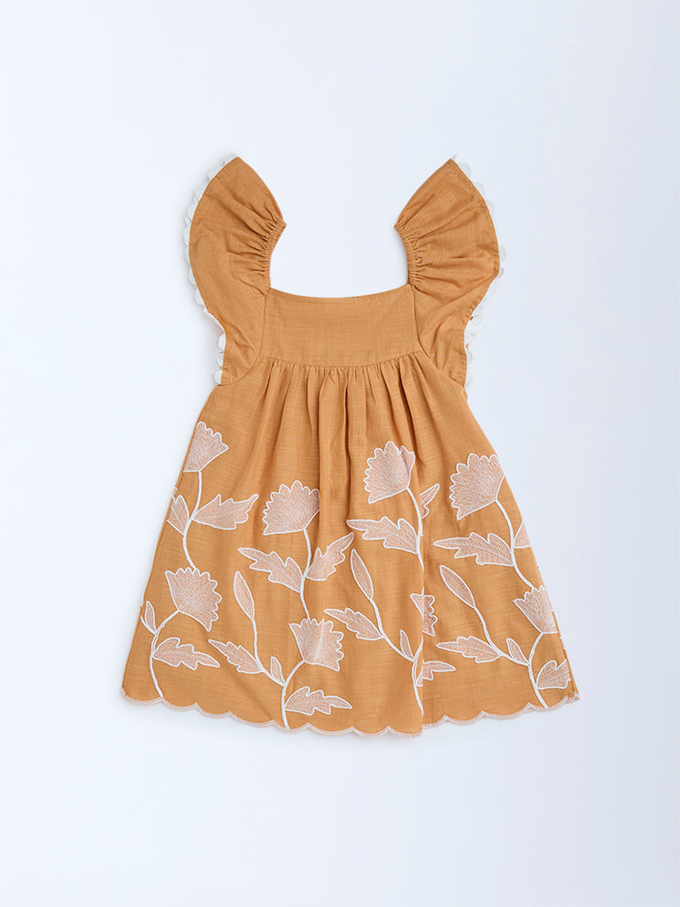 HOP Kids Orange Floral Embroidered Cotton Dress