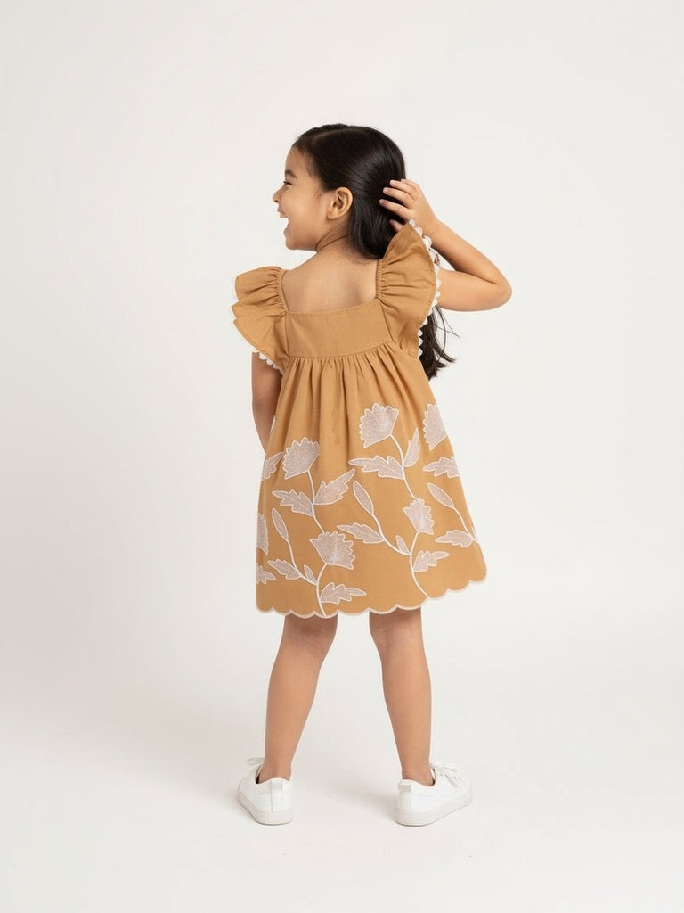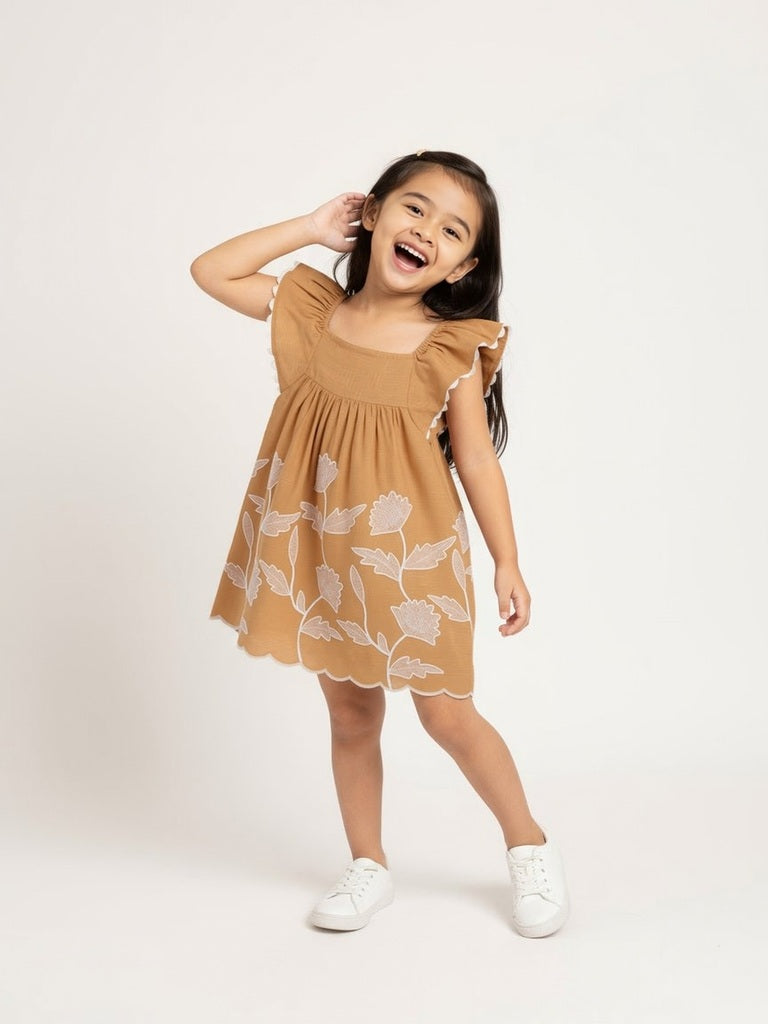 HOP Kids brings a vibrant touch to everyday dressing with this orange cotton dress. Crafted from breathable fabric. it features floral embroidery for playful charm. The square neckline and butterfly sleeves lend a light. girlish appeal. while pleated detailing through the skirt adds graceful movement. Perfect for sunny outings and casual days alike.