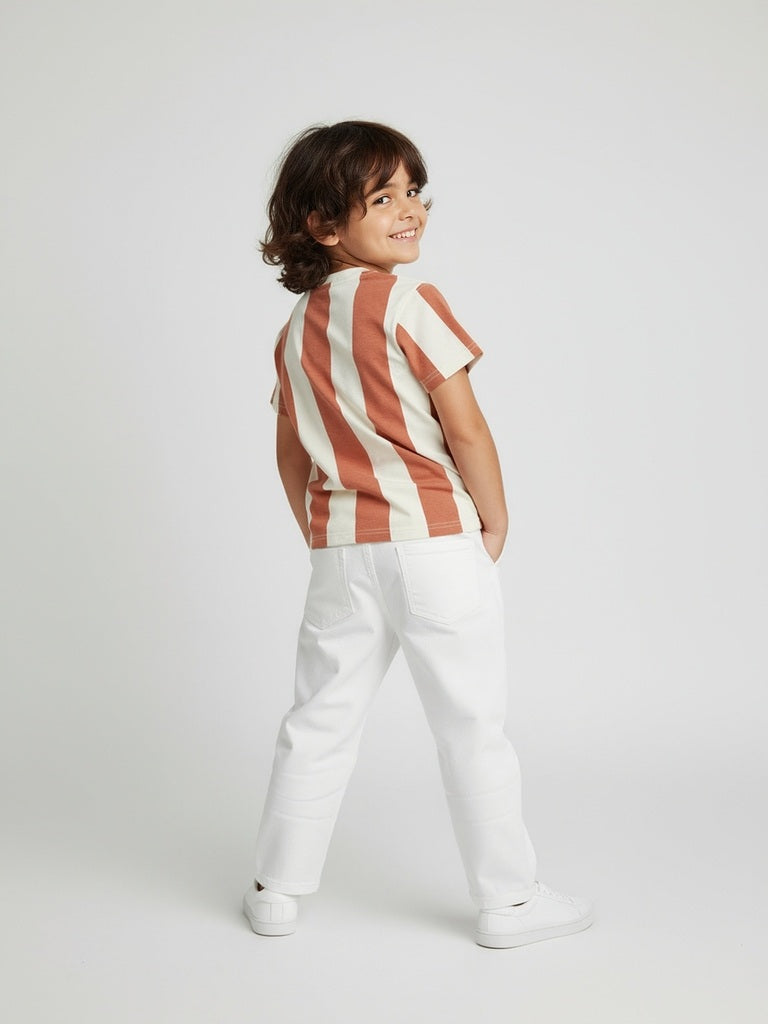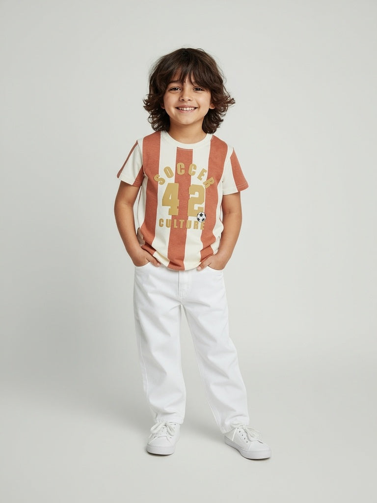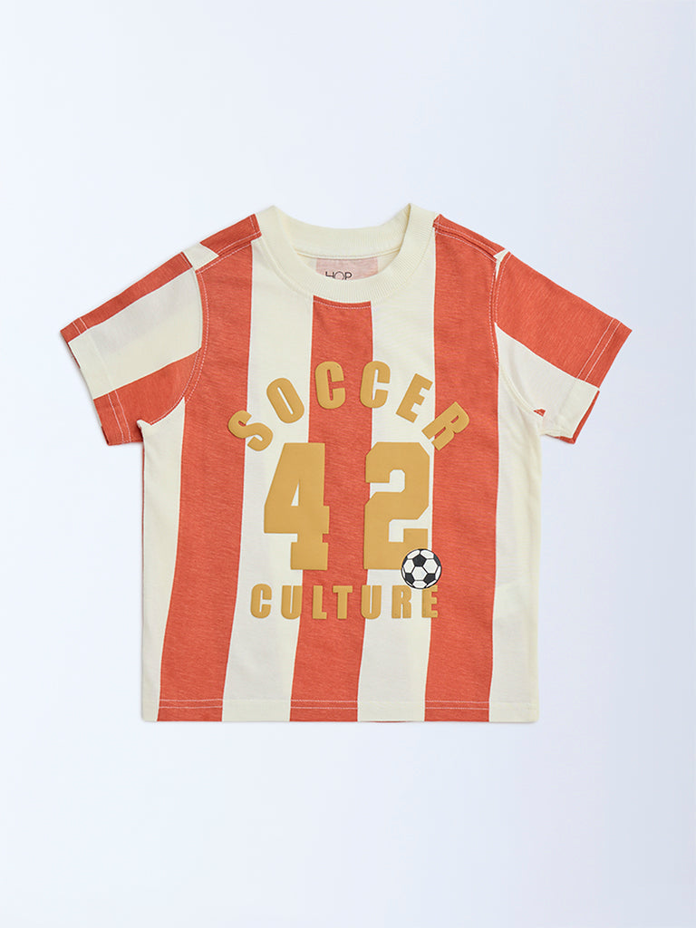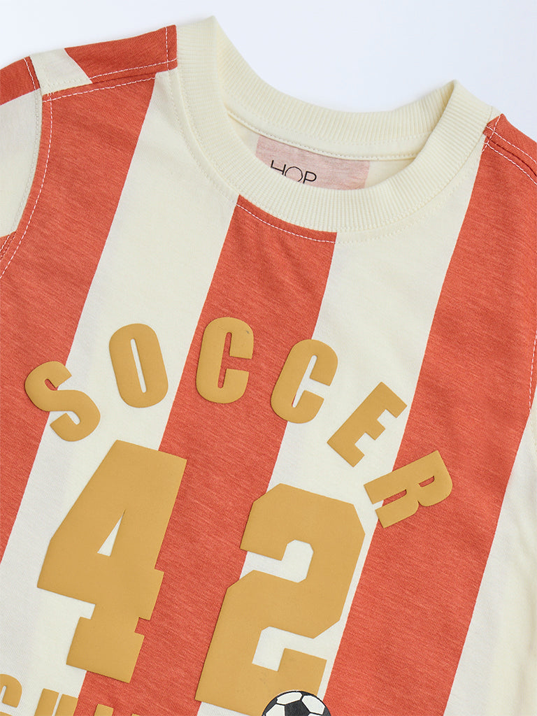 Kick off his playground line-up with this vibrant orange t-shirt from HOP Kids. Milled from pure cotton for ultimate comfort. it features a bold striped base with soccer-inspired text. The ribbed crew neck and short sleeves offer easy comfort for everyday play.
