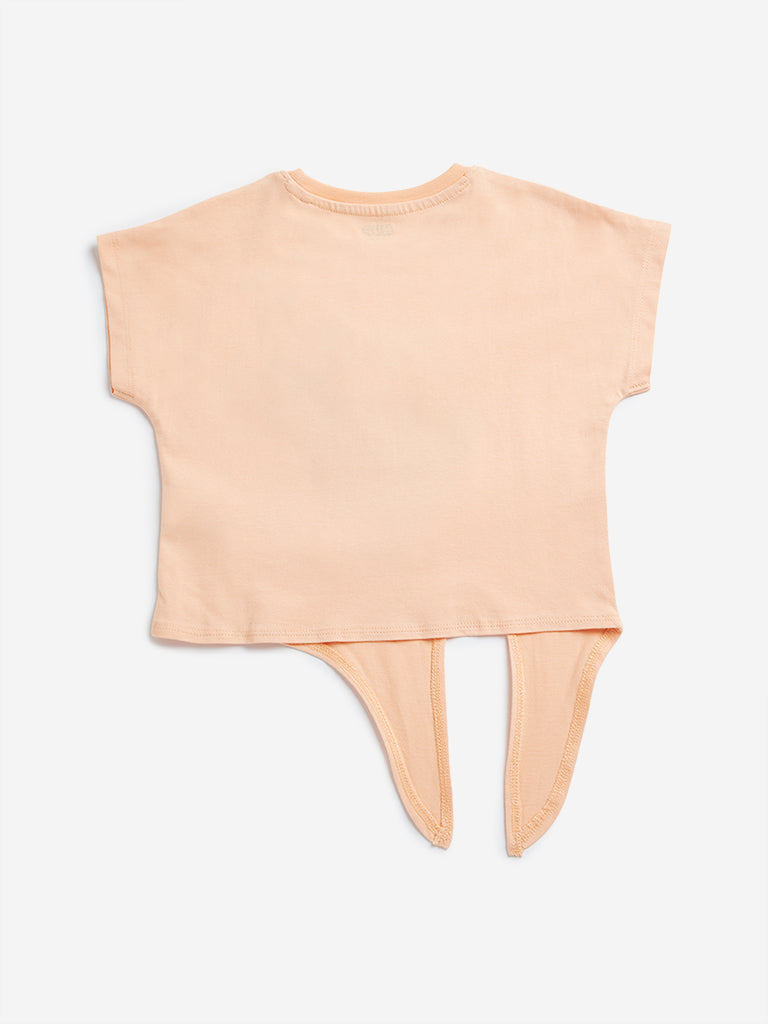 This peach HOP kids top is designed with a round neck and short-sleeves. It is adorned with a cute basket pattern. text prints and a tie-up feature for a charming finish.