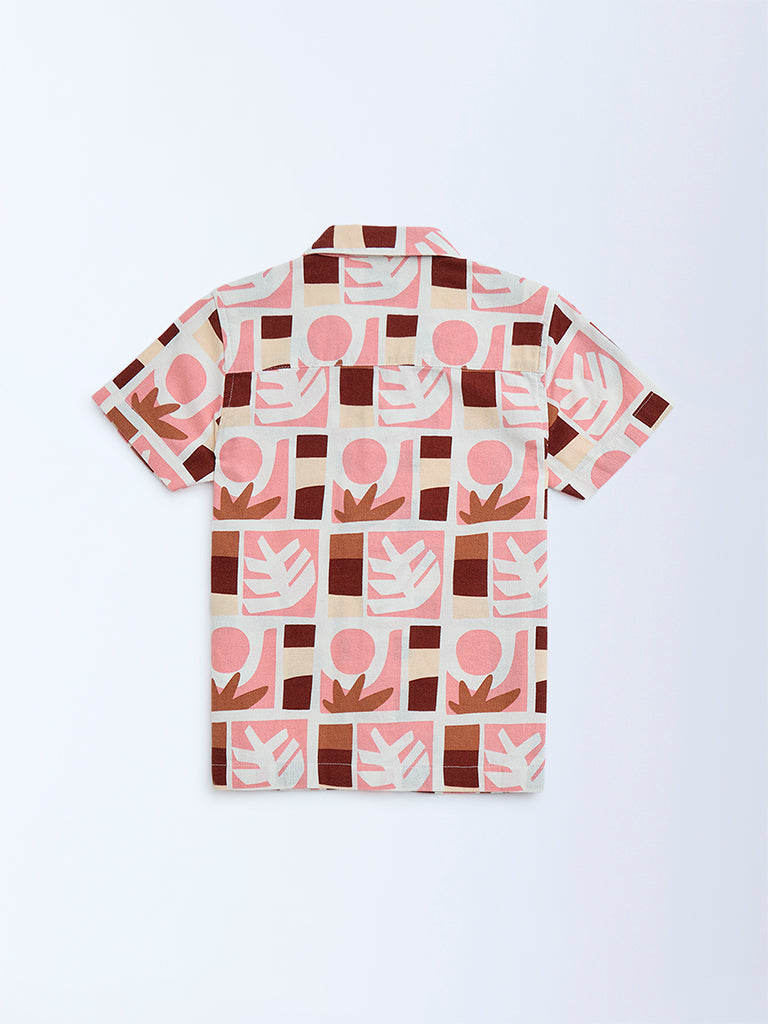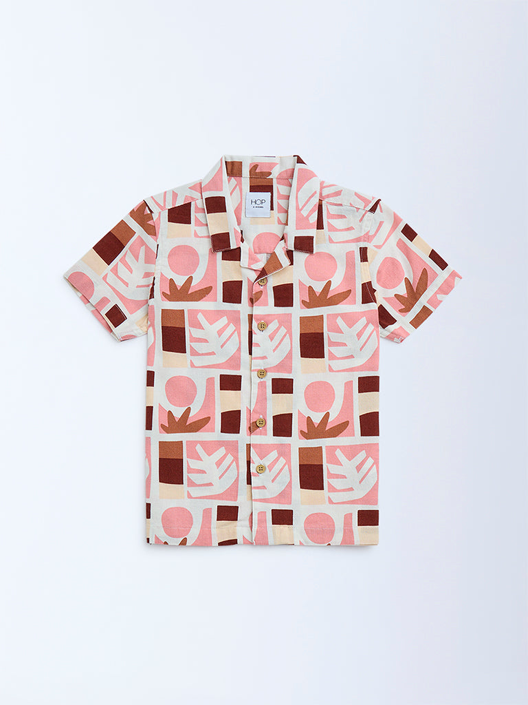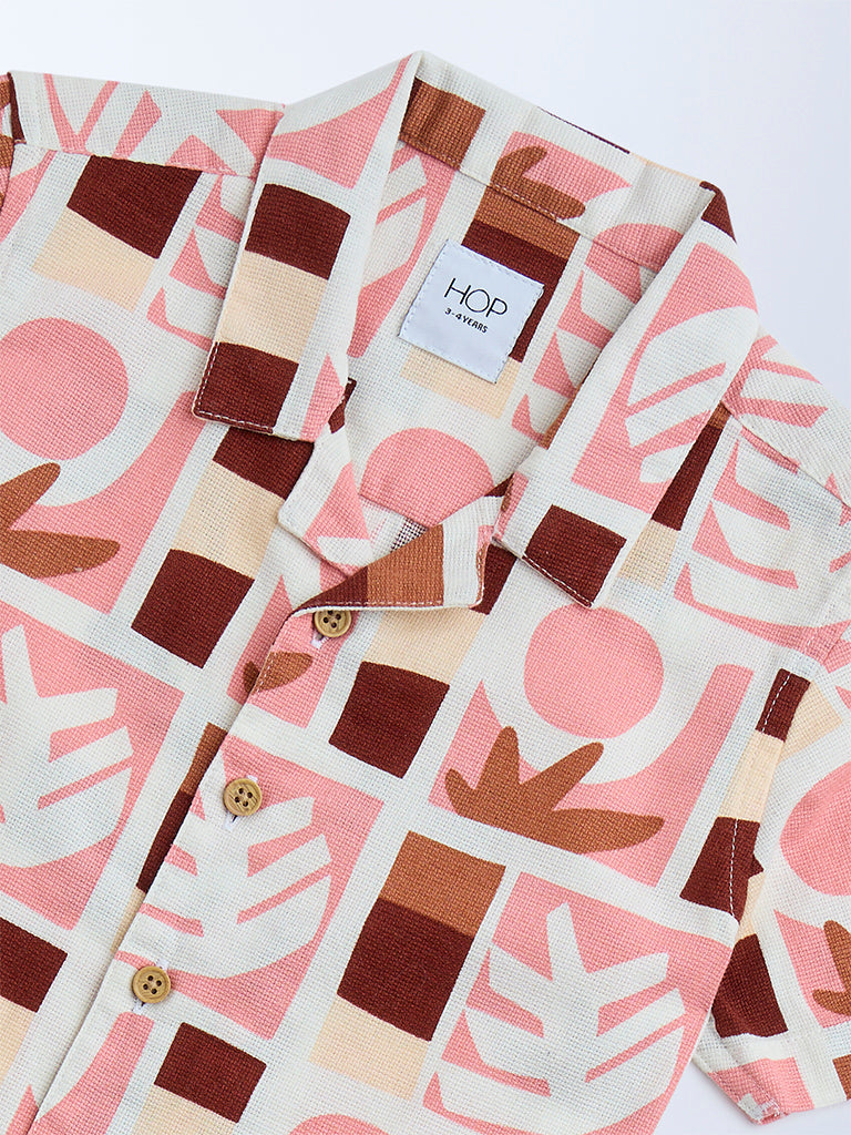 Give their holiday line-up a cheerful refresh with this peach shirt from HOP Kids. Milled from pure cotton. it keeps them cool and comfortable through busy playdates or sunny outings. The retro-inspired print adds a stylish nod to grown-up fashion while a camp collar. short sleeves. and a neat button placket complete its style.