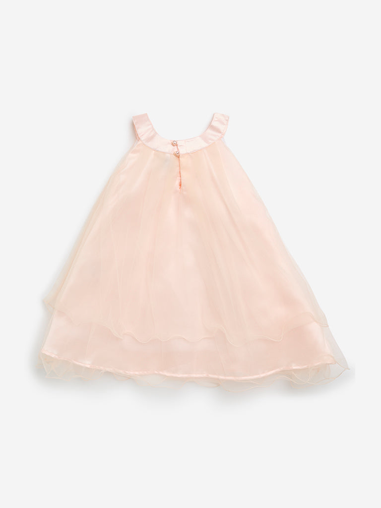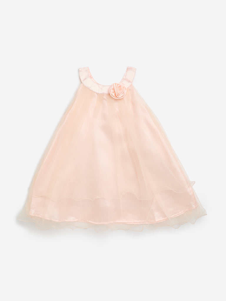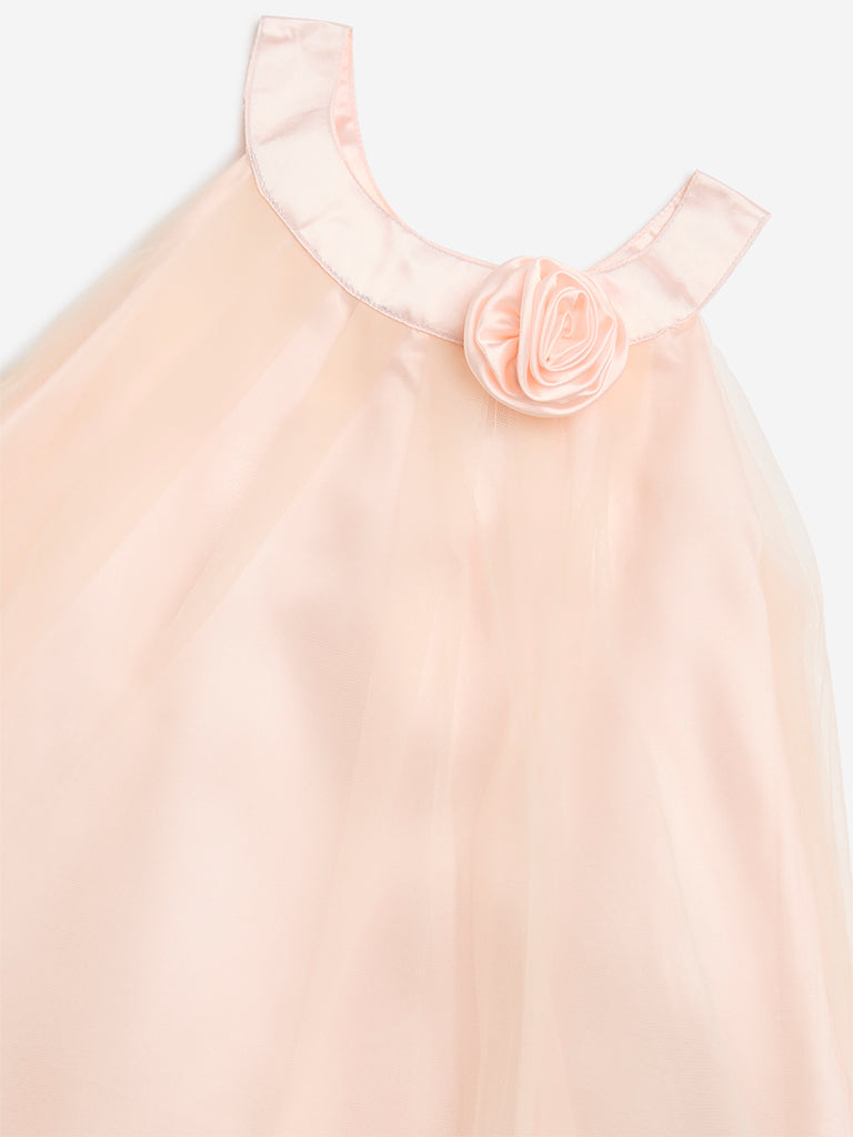 This peach dress from HOP Kids is crafted from lightweight fabric for effortless movement and comfort. A soft mesh overlay adds a layered effect. while the rosette detail at the neckline brings a delicate touch. This A-line dress is an ideal pick for special occasions and celebrations for your little one.