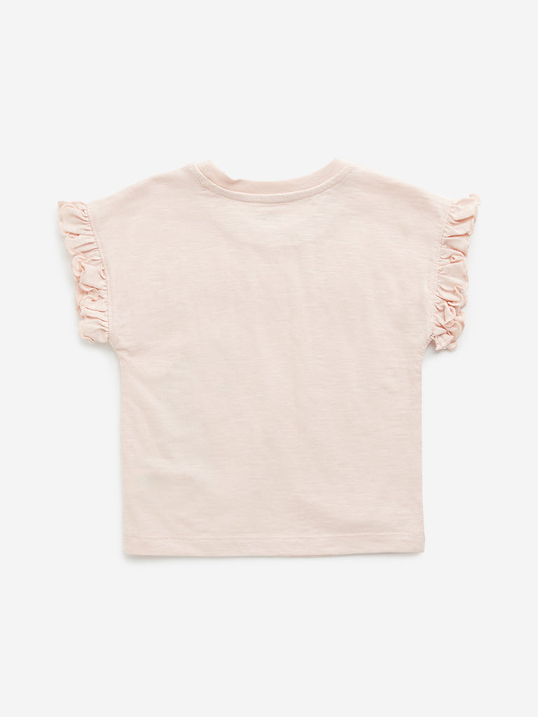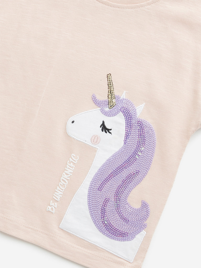 HOP Kids Peach Unicorn Embellished Cotton T-Shirt