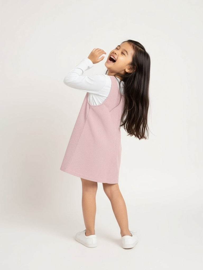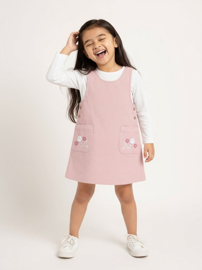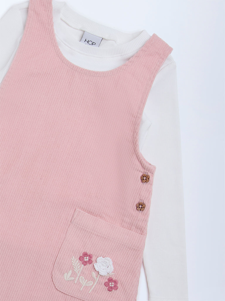 This pink pinafore set from HOP Kids comes with a white cotton T-shirt for an easy layered look. The pinafore is styled with side button detailing and front pockets accented with delicate floral embroidery. making it a charming and comfortable outfit for everyday wear.