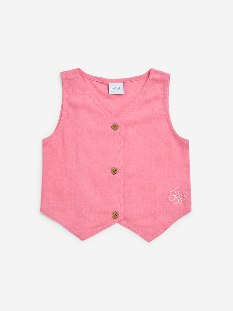 Brighten up your little one’s wardrobe with this pink waistcoat from HOP Kids. Milled from a rich linen-blend for a breezy feel. it features delicate embroidered detailing and charming applique accents. The V-neck. button-down front. and sleeveless cut add a stylish touch. making it perfect for warm-weather outings!