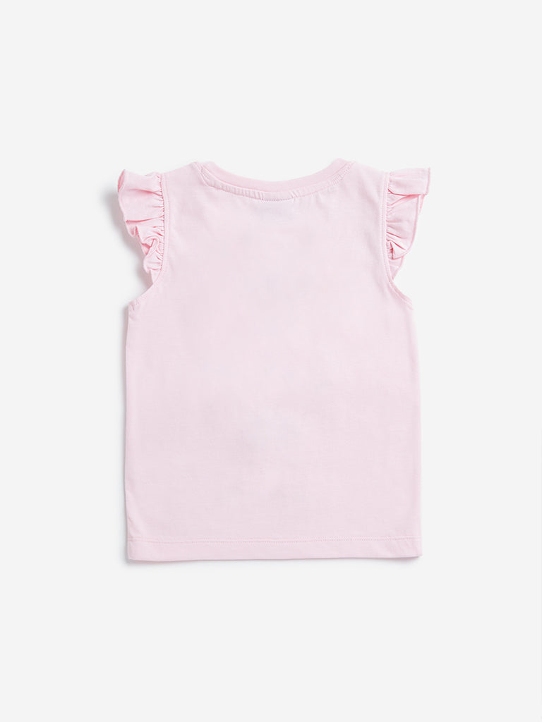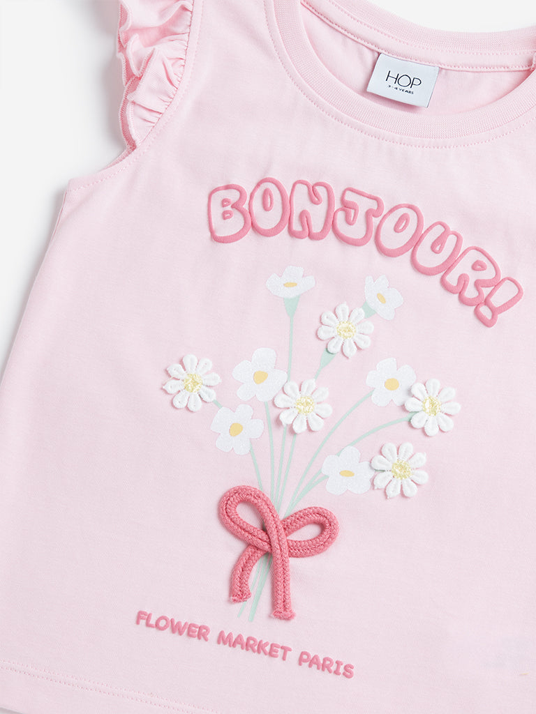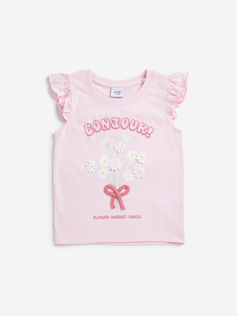 This HOP kids pink top showcases a floral applique coupled with text prints and a bow detailing for added charm. It comes finished with a round neck and ruffle sleeves.